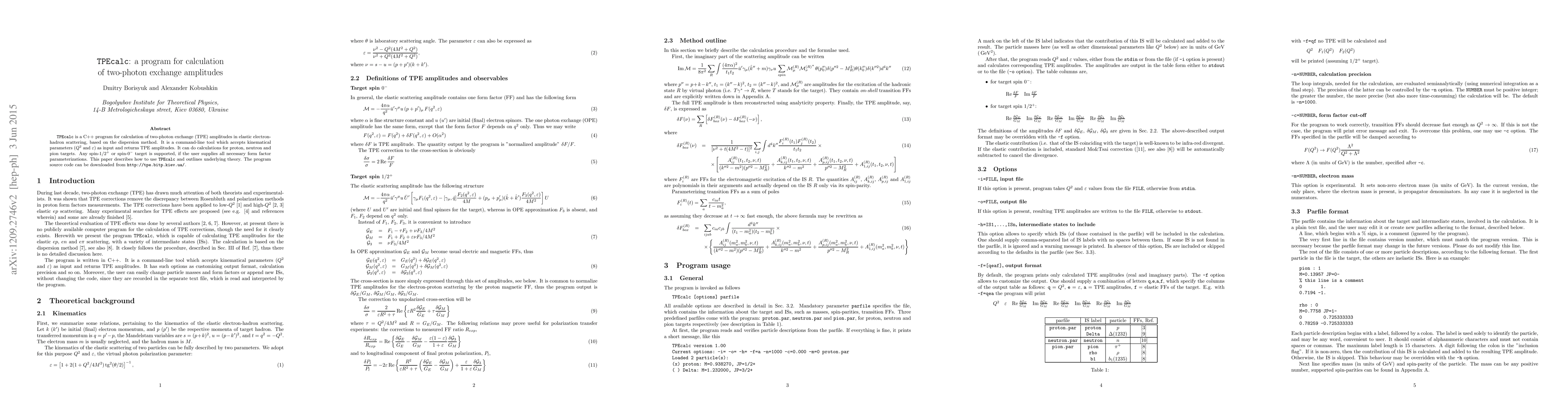 TPEcalc is a C++ program for calculation of two-photon exchange (TPE) amplitudes in elastic electron-hadron scattering, based on the dispersion method. It is a command-line tool which accepts kinematical parameters (Q^2 and epsilon) as input and returns TPE amplitudes. It can do calculations for proton, neutron and pion targets. Any spin 1/2+ or spin 0- target is supported, if the user supplies all necessary form factor parameterizations. This paper describes how to use TPEcalc and outlines underlying theory. The program source code can be downloaded from http://tpe.bitp.kiev.ua/