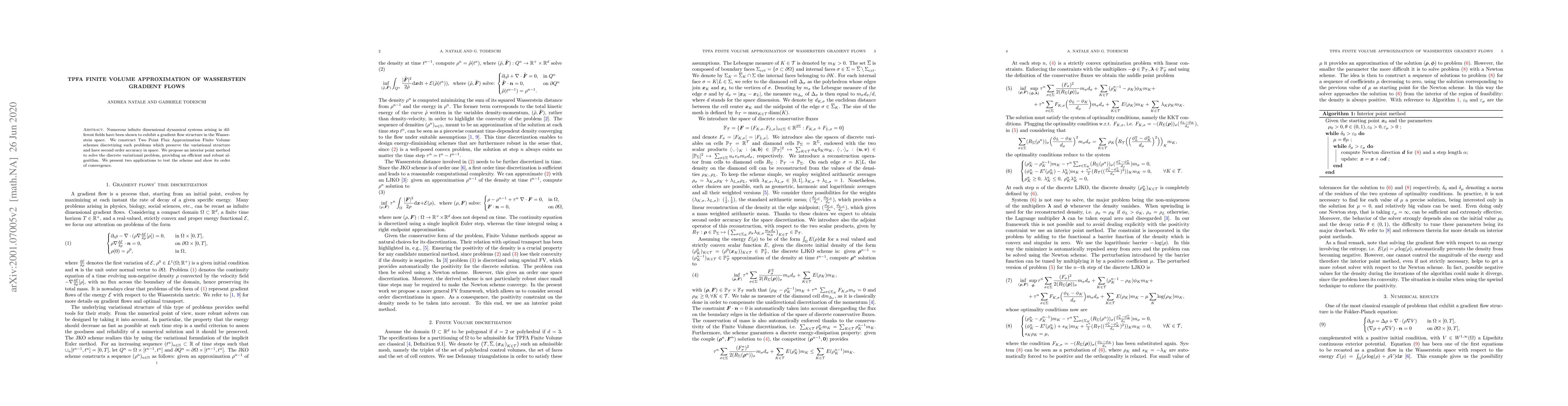 This paper develops Two Point Flux Approximation Finite Volume schemes for discretizing Wasserstein gradient flows, preserving variational structure and achieving second-order spatial accuracy. An interior point method is proposed to solve the discrete variational problem efficiently, and the scheme's convergence is demonstrated through two applications.