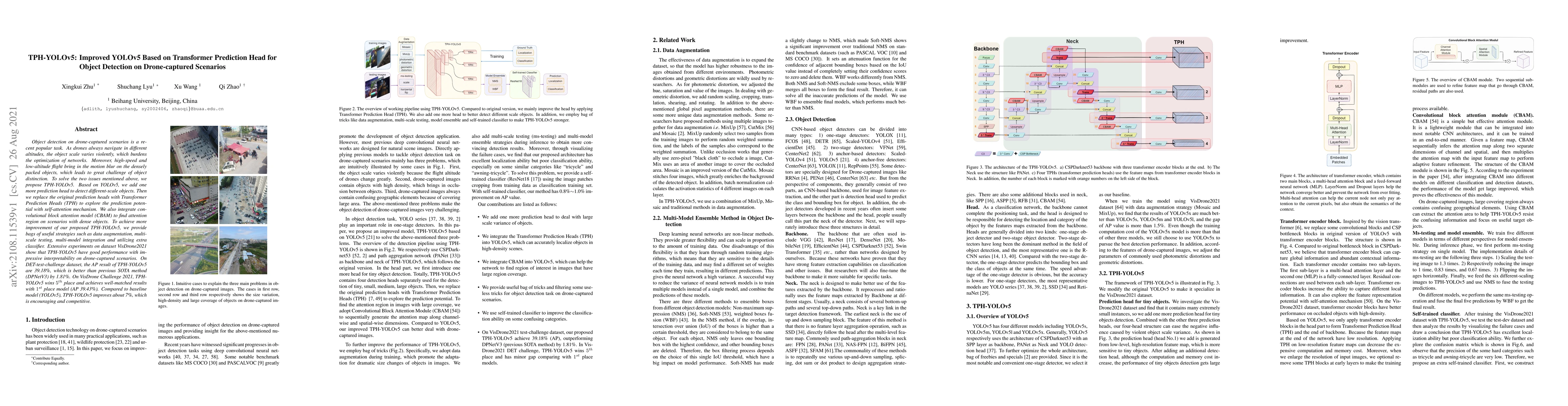 TPH-YOLOv5 enhances YOLOv5 with a Transformer Prediction Head and CBAM to tackle scale variation and motion blur in drone-captured object detection scenarios. Experiments show it outperforms previous methods, achieving an AP of 39.18% on DET-test-challenge dataset and securing 5th place in VisDrone Challenge 2021.