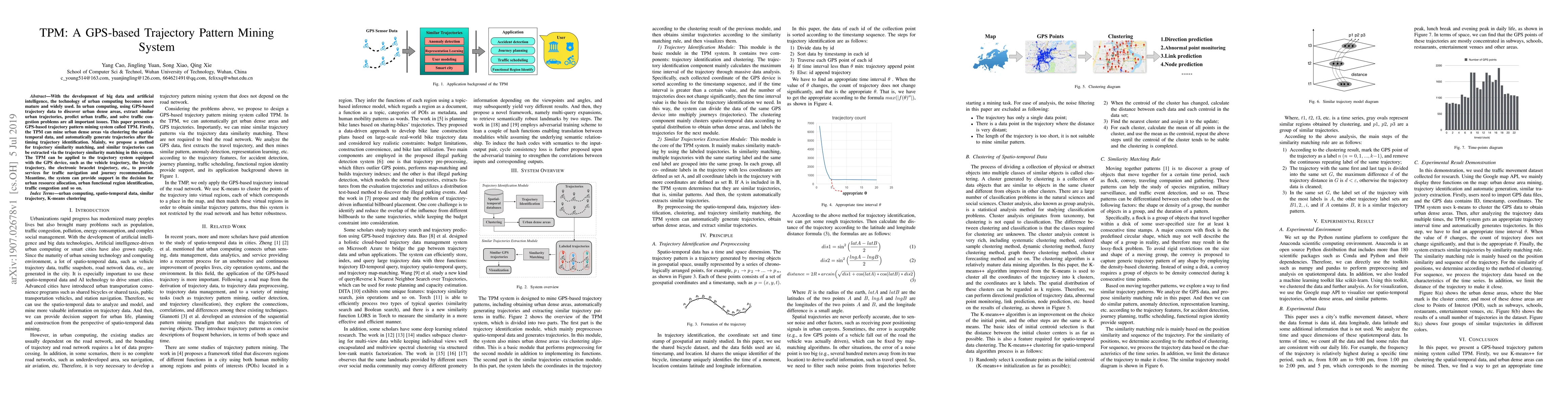 The paper presents TPM, a GPS-based trajectory pattern mining system that utilizes K-means++ for clustering spatial-temporal data to mine urban dense areas. It identifies trajectories by calculating the maximum time interval and then divides the data into multiple journeys (trajectories). The system also extracts similar trajectories using a similarity matching rule based on position similarity and sequence of the trajectory.