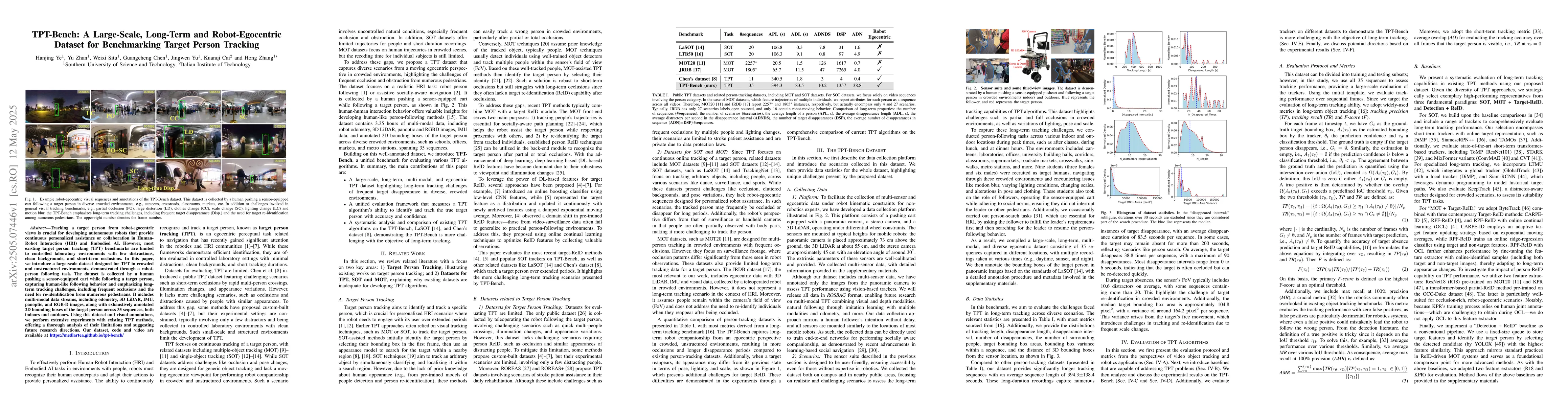 Unlike existing TPT benchmarks confined to controlled laboratory settings, TPT-Bench emphasizes real-world challenges by capturing data in crowded, unstructured indoor and outdoor environments, focusing on long-term tracking with frequent occlusions and re-identification needs.