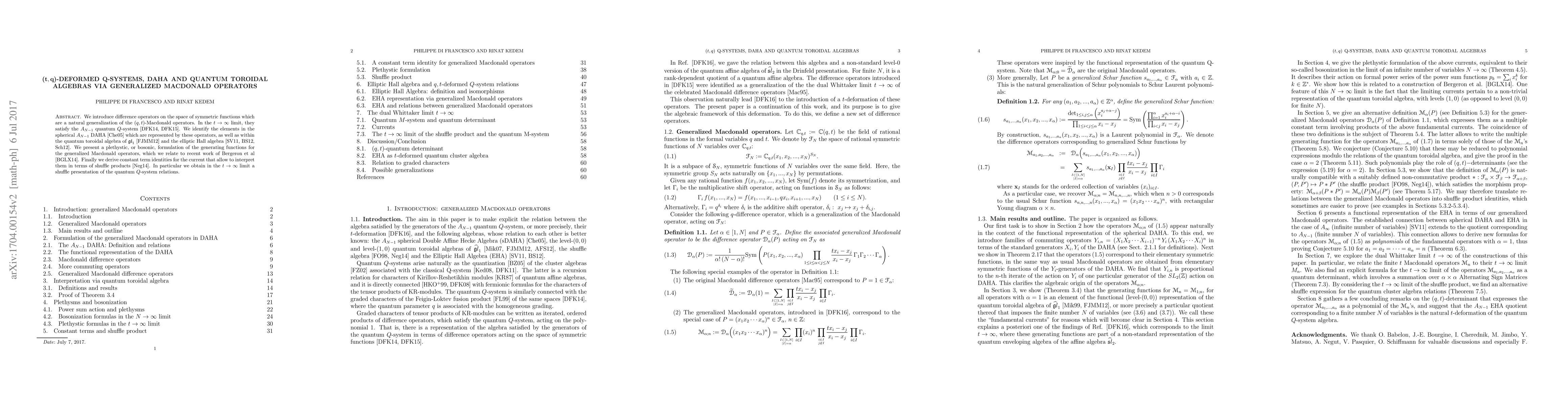 We introduce difference operators on the space of symmetric functions which are a natural generalization of the $(q,t)$-Macdonald operators. In the $t\to\infty$ limit, they satisfy the $A_{N-1}$ quantum $Q$-system. We identify the elements in the spherical $A_{N-1}$ DAHA which are represented by these operators, as well as within the quantum toroidal algebra of $gl_1$ and the elliptic Hall algebra. We present a plethystic, or bosonic, formulation of the generating functions for the generalized Macdonald operators, which we relate to recent work of Bergeron et al. Finally we derive constant term identities for the current that allow to interpret them in terms of shuffle products. In particular we obtain in the $t\to\infty$ limit a shuffle presentation of the quantum $Q$-system relations.