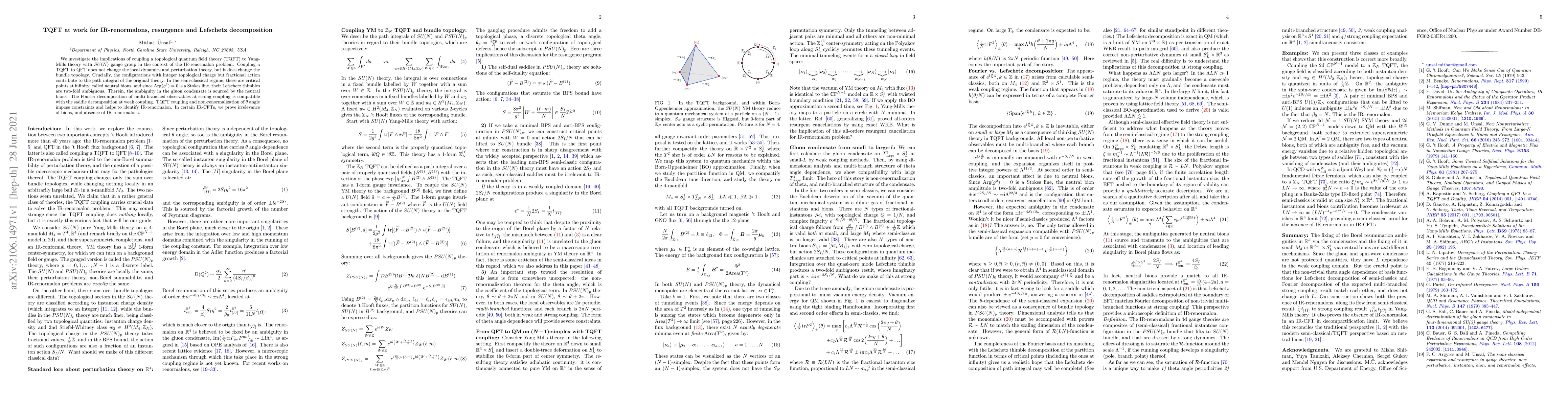 We investigate the implications of coupling a topological quantum field theory (TQFT) to Yang-Mills theory with $SU(N)$ gauge group in the context of the IR-renormalon problem. Coupling a TQFT to QFT does not change the local dynamics and perturbation theory, but it does change the bundle topology. Crucially, the configurations with integer topological charge but fractional action contribute to the path integral of the original theory. In the semi-classical regime, these are critical points at infinity, called neutral bions, and since ${\rm Arg}(g^2)=0$ is a Stokes line, their Lefschetz thimbles are two-fold ambiguous. Therein, the ambiguity in the gluon condensate is sourced by the neutral bions. The Fourier decomposition of multi-branched observables at strong coupling is compatible with the saddle decomposition at weak coupling. TQFT coupling and non-renormalization of $\theta$ angle impose constraints and helps to identify IR-renormalon. In certain IR-CFTs, we prove irrelevance of bions, and absence of IR-renormalons.