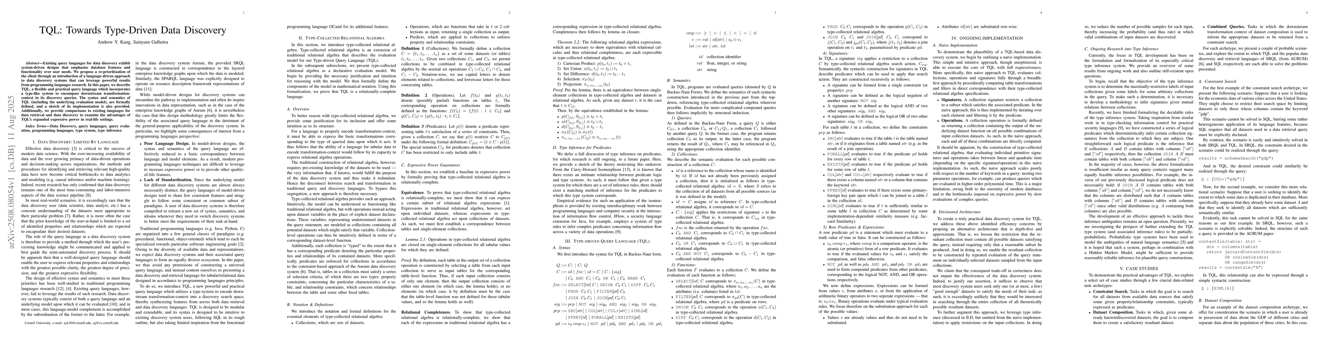 The introduction of TQL, a type-driven query language with a formal type-collected relational algebra model, enhancing expressive power for data discovery tasks.