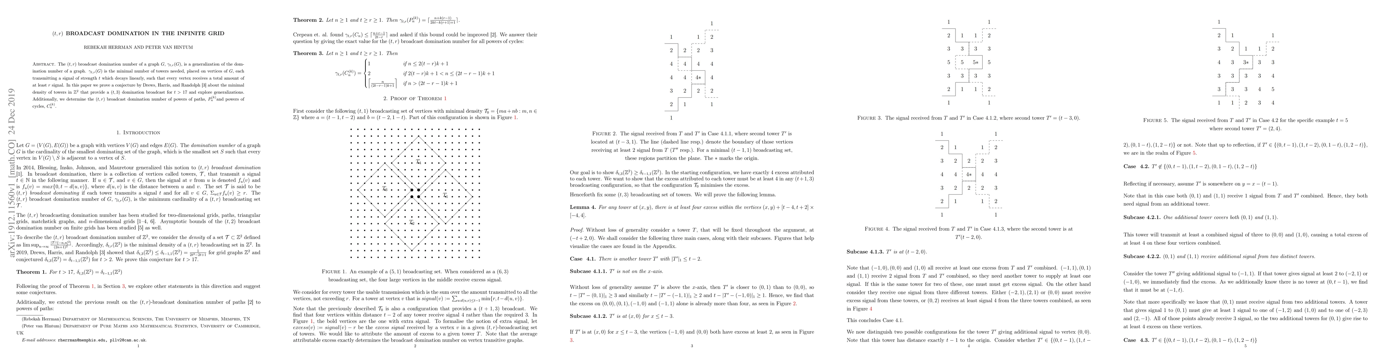 This paper proves a conjecture regarding the minimal density of towers in the infinite grid $\mathbb{Z}^2$ to achieve $(t,3)$ broadcast domination for $t>17$ and explores $(t,r)$ broadcast domination numbers for powers of paths and cycles.