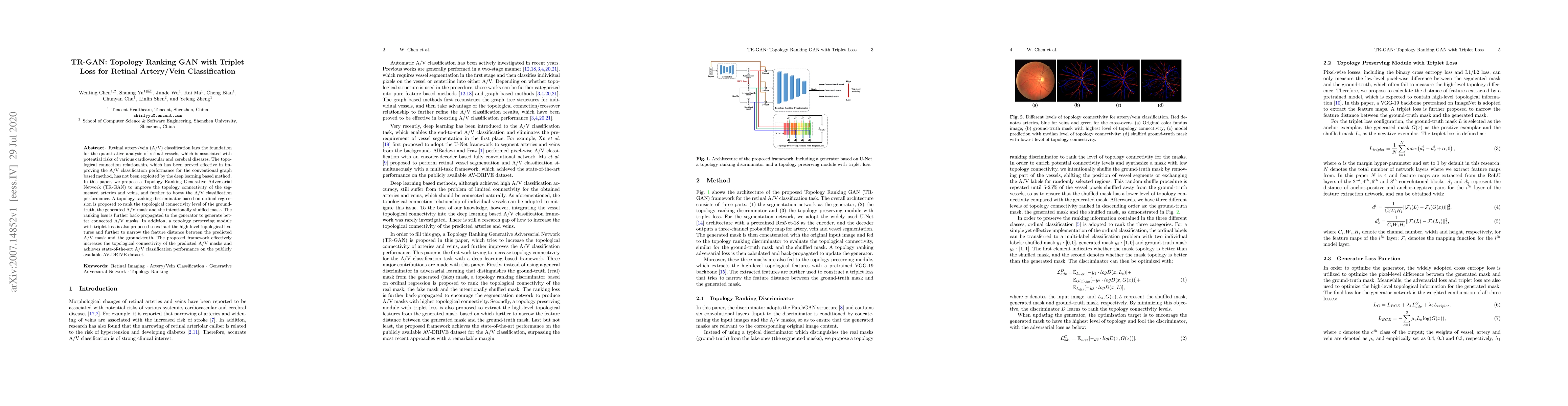 The paper introduces TR-GAN, a Topology Ranking Generative Adversarial Network with triplet loss, to enhance retinal artery/vein classification by improving topological connectivity. It employs a topology ranking discriminator and a topology preserving module to generate better connected A/V masks, achieving superior classification performance on the AV-DRIVE dataset.