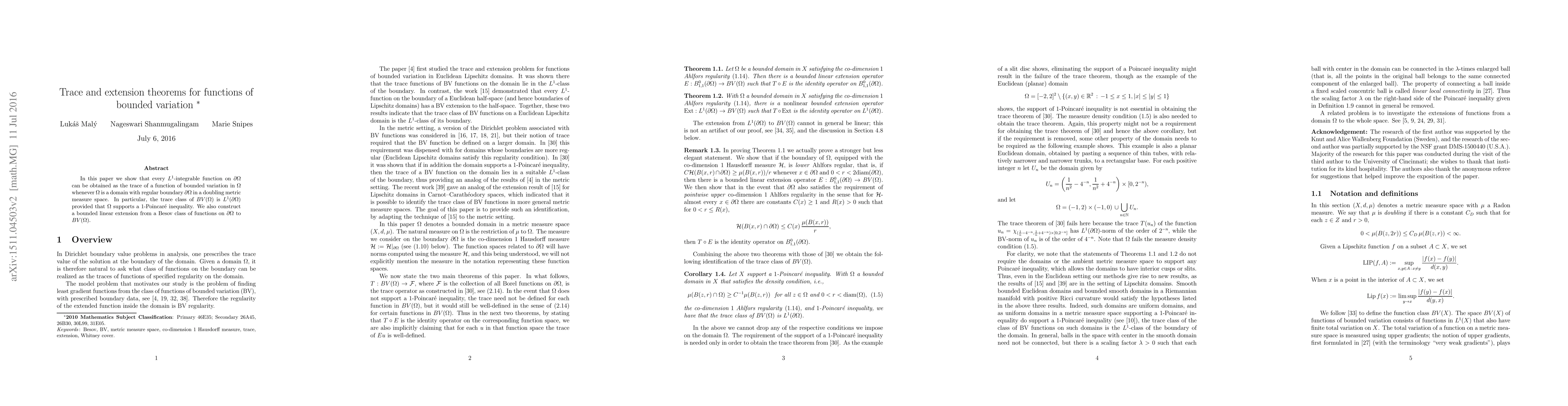 The paper establishes trace and extension theorems for functions of bounded variation in doubling metric measure spaces, utilizing properties of Besov classes and 1-Poincaré inequality.