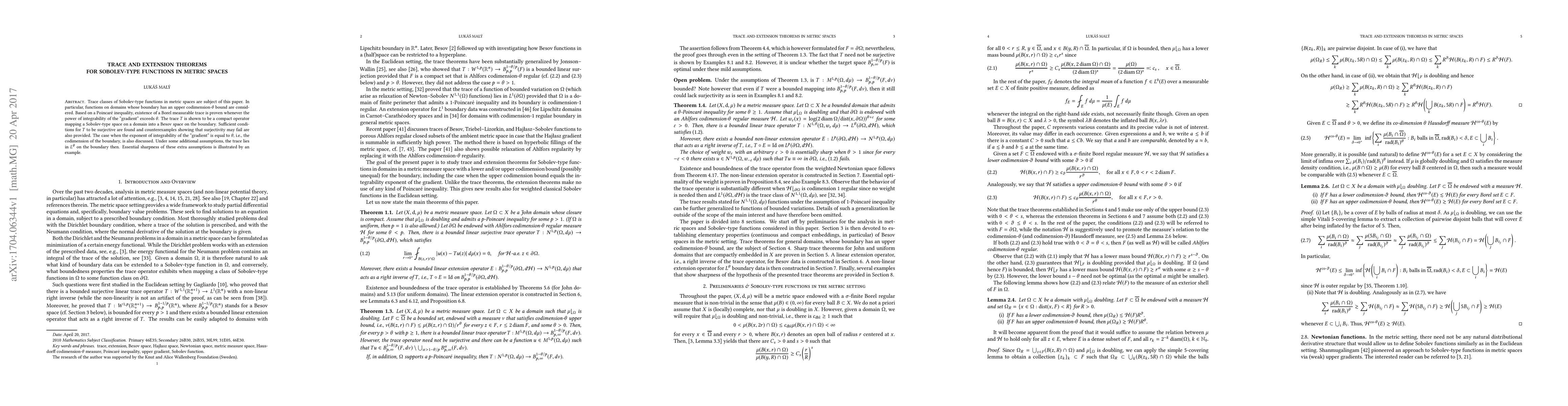 The paper establishes trace and extension theorems for Sobolev-type functions in metric spaces, providing conditions under which a measurable trace exists and is compact, and analyzing the surjectivity of the trace operator.