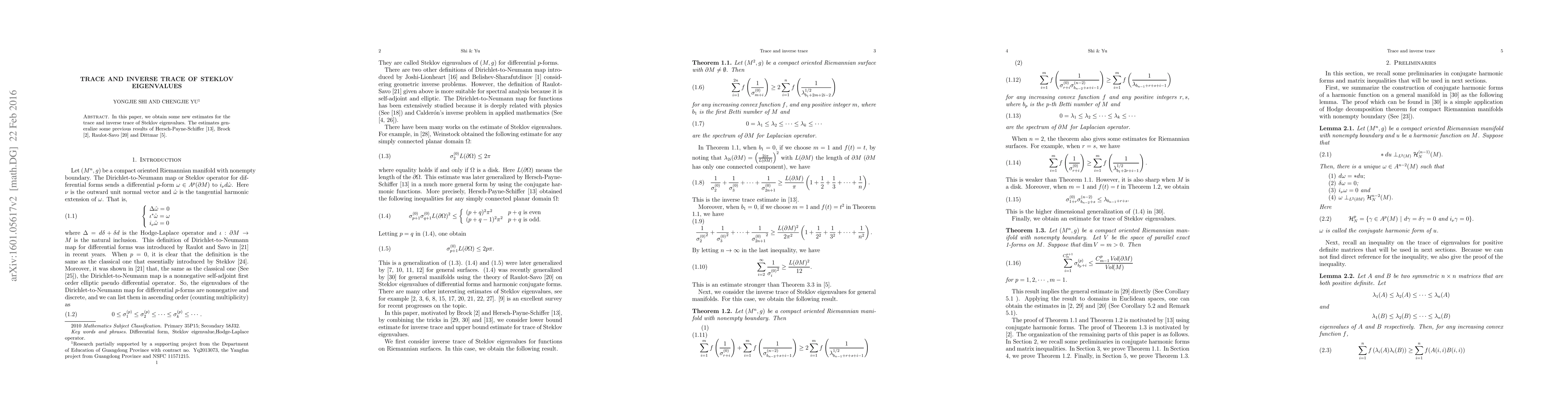 Summary: This paper presents new estimates for the trace and inverse trace of Steklov eigenvalues, extending previous results from Hersch-Payne-Schiffer, Brock, Raulot-Savo, and Dittmar. The findings provide a broader understanding of the spectral properties of Steklov problems.