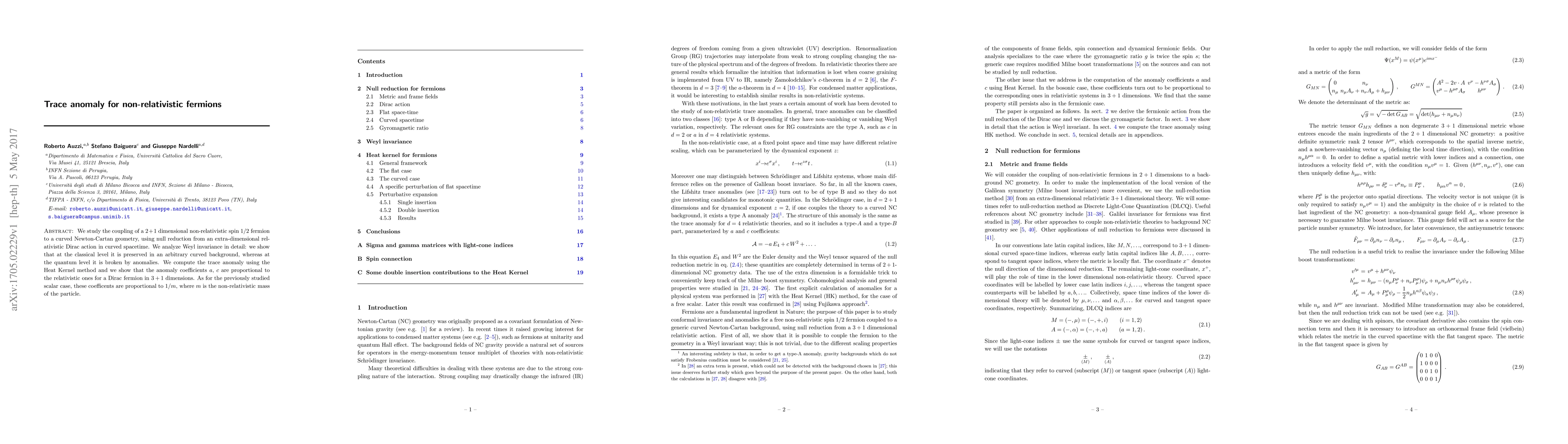 This paper investigates the coupling of non-relativistic fermions in 2+1 dimensions to a curved Newton-Cartan geometry, revealing that while Weyl invariance is preserved classically, it is broken at the quantum level by trace anomalies. The computed trace anomaly coefficients are proportional to those of relativistic Dirac fermions in 3+1 dimensions and inversely proportional to the non-relativistic mass.
