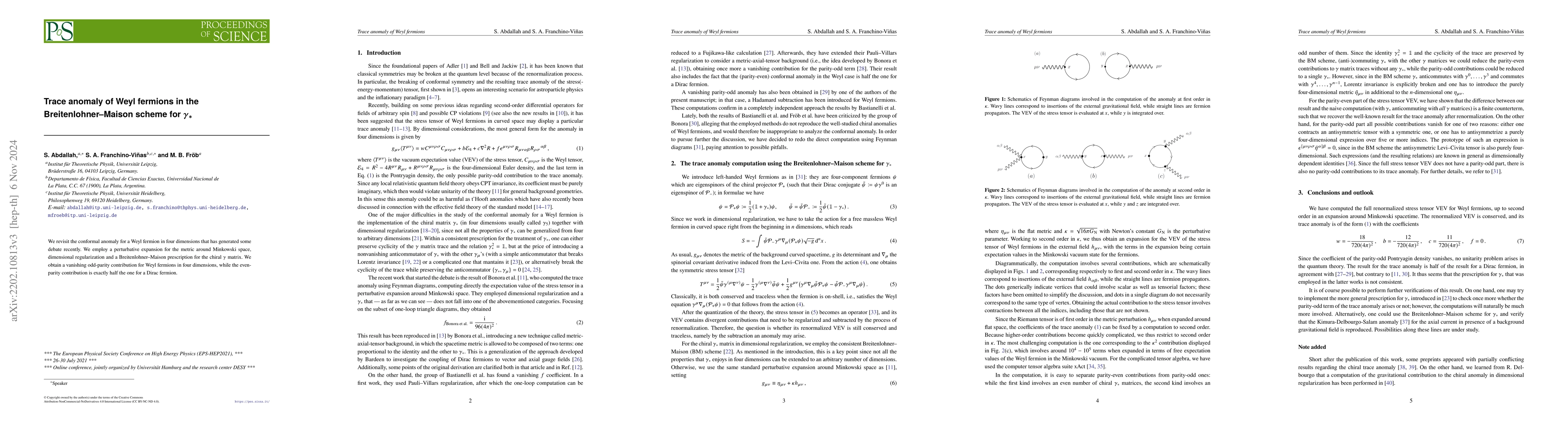 The paper presents a detailed calculation of the trace anomaly for Weyl fermions using dimensional regularization and the Breitenlohner--Maison scheme for the chiral $\gamma$ matrix, resolving discrepancies in previous findings.