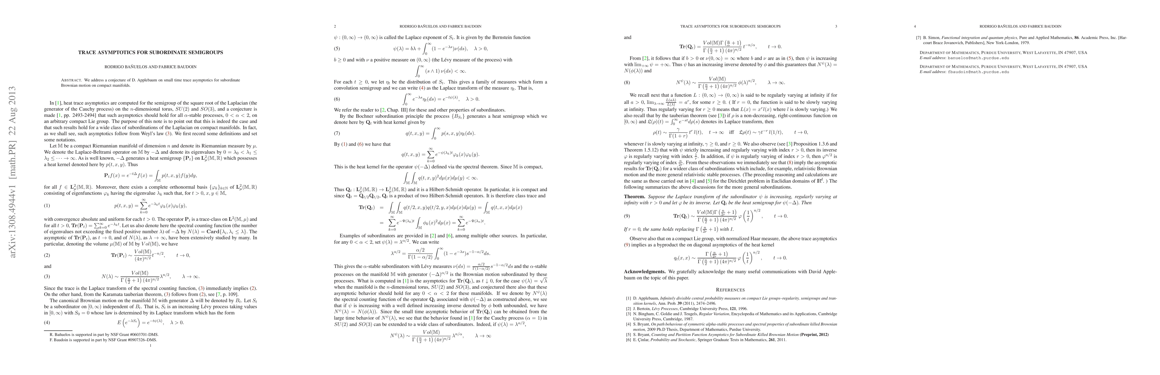The paper investigates and resolves a conjecture by D. Applebaum, providing insights into small-time trace asymptotics for subordinate Brownian motion on compact manifolds using advanced mathematical techniques.