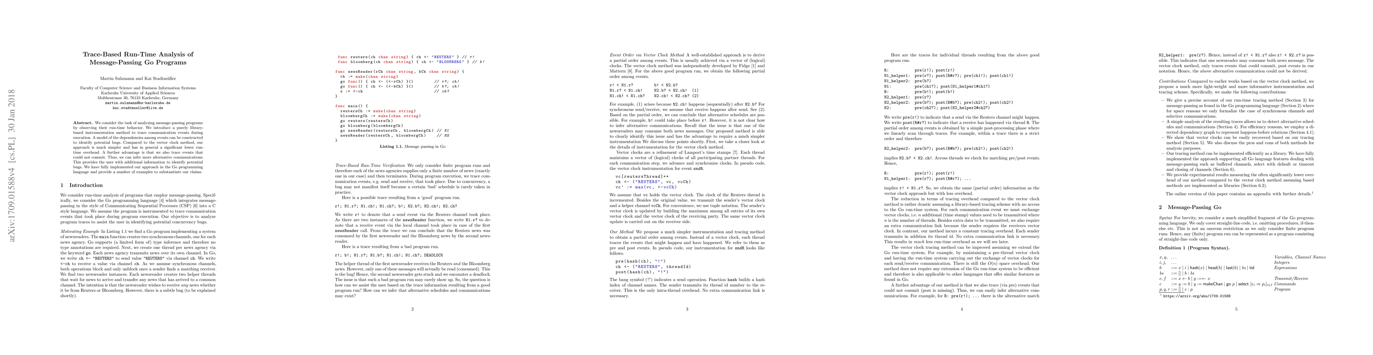 We consider the task of analyzing message-passing programs by observing their run-time behavior. We introduce a purely library-based instrumentation method to trace communication events during execution. A model of the dependencies among events can be constructed to identify potential bugs. Compared to the vector clock method, our approach is much simpler and has in general a significant lower run-time overhead. A further advantage is that we also trace events that could not commit. Thus, we can infer alternative communications. This provides the user with additional information to identify potential bugs. We have fully implemented our approach in the Go programming language and provide a number of examples to substantiate our claims.