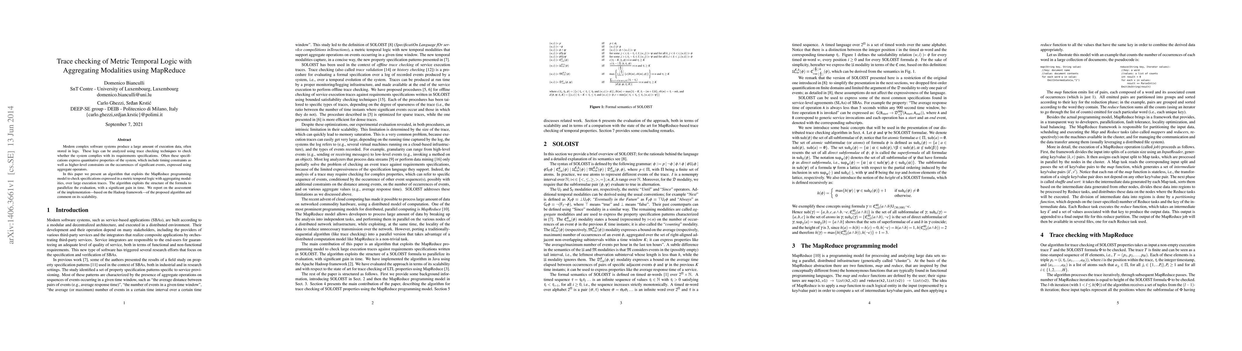 This paper proposes an algorithm leveraging MapReduce for checking metric temporal logic specifications with aggregating modalities over large execution logs, achieving significant time gains through parallel evaluation. The implementation, based on Hadoop, demonstrates scalability in handling extensive trace data.