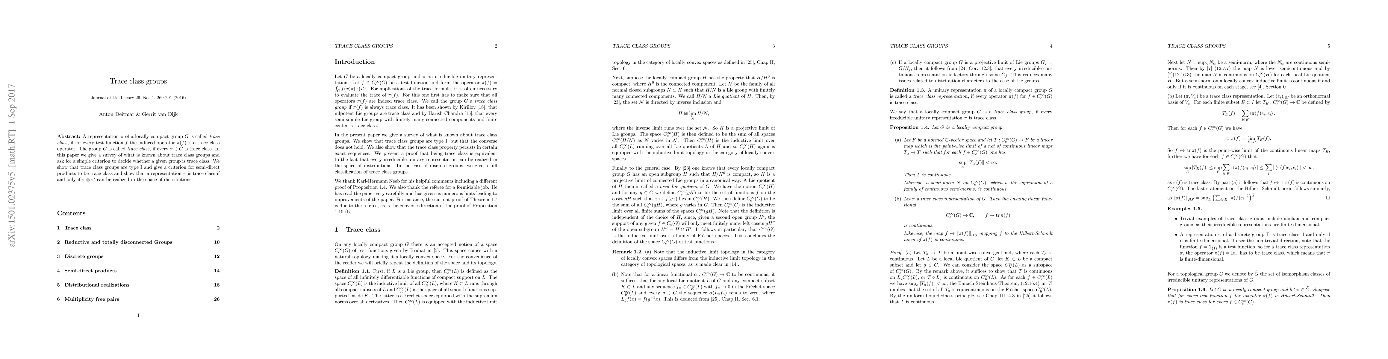 Summary: This paper explores the concept of trace class groups, proving that such groups are type I and providing criteria for semi-direct products to be trace class. It also establishes a condition for a representation to be trace class based on the realizability of its tensor product in the space of distributions.