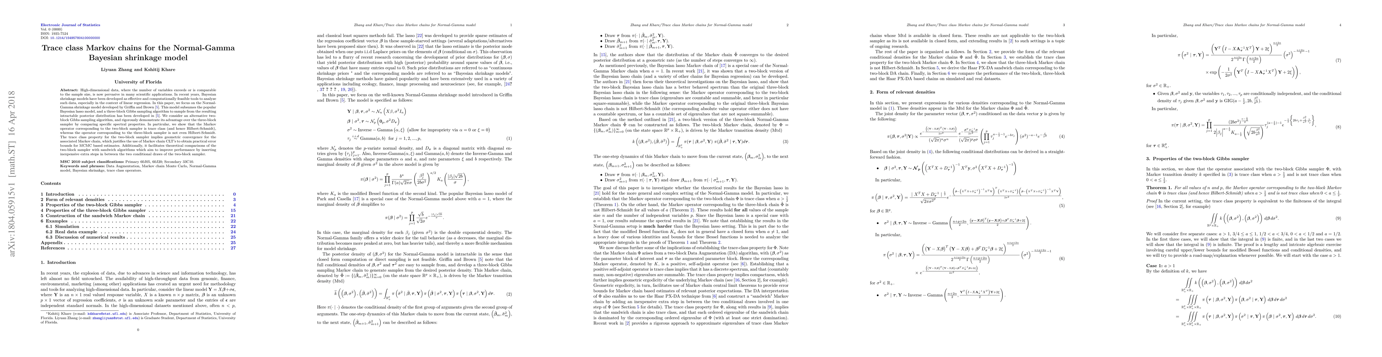High-dimensional data, where the number of variables exceeds or is comparable to the sample size, is now pervasive in many scientific applications. In recent years, Bayesian shrinkage models have been developed as effective and computationally feasible tools to analyze such data, especially in the context of linear regression. In this paper, we focus on the Normal-Gamma shrinkage model developed by Griffin and Brown. This model subsumes the popular Bayesian lasso model, and a three-block Gibbs sampling algorithm to sample from the resulting intractable posterior distribution has been developed by Griffin and Brown. We consider an alternative two-block Gibbs sampling algorithm and rigorously demonstrate its advantage over the three-block sampler by comparing specific spectral properties. In particular, we show that the Markov operator corresponding to the two-block sampler is trace class (and hence Hilbert-Schmidt), whereas the operator corresponding to the three-block sampler is not even Hilbert-Schmidt. The trace class property for the two-block sampler implies geometric convergence for the associated Markov chain, which justifies the use of Markov chain CLT's to obtain practical error bounds for MCMC based estimates. Additionally, it facilitates theoretical comparisons of the two-block sampler with sandwich algorithms which aim to improve performance by inserting inexpensive extra steps in between the two conditional draws of the two-block sampler.