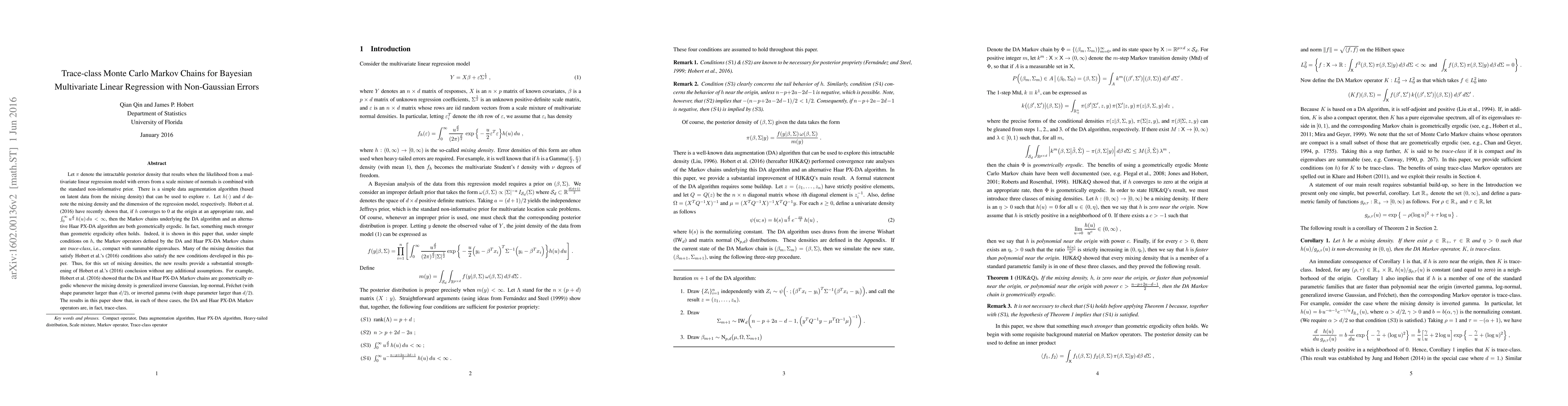 This paper extends the analysis of Monte Carlo Markov Chains for Bayesian multivariate linear regression with non-Gaussian errors, showing that under certain conditions, the Markov operators of the data augmentation and Haar PX-DA algorithms are trace-class, providing stronger ergodicity results than previously established.