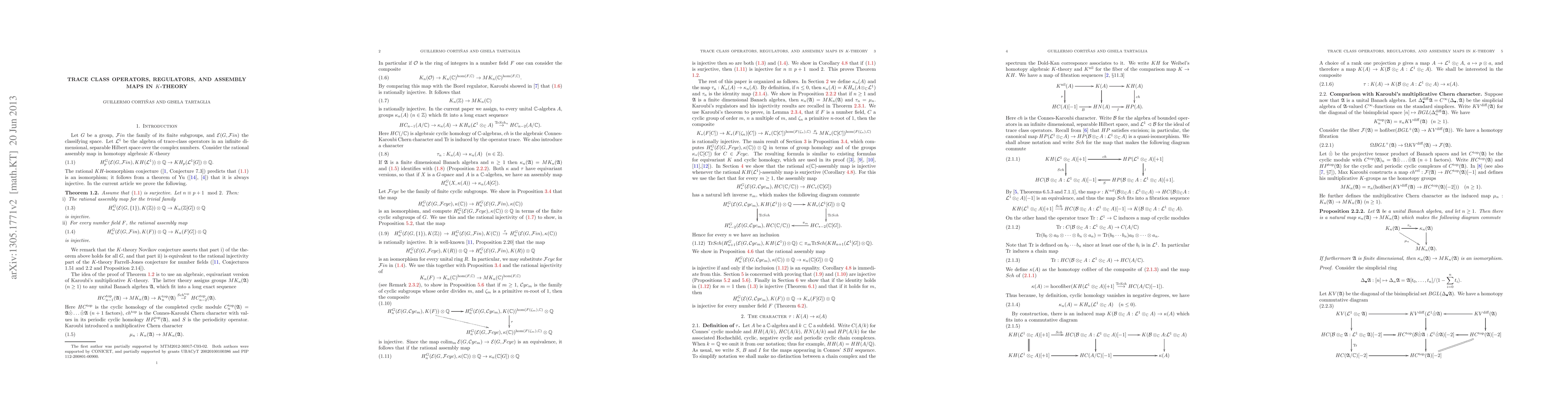 Let G be a group, Fin the family of its finite subgroups, and E(G,Fin) the classifying space. Let L^1 be the algebra of trace-class operators in an infinite dimensional, separable Hilbert space over the complex numbers. Consider the rational assembly map in homotopy algebraic K-theory H_p^G(E(G,Fin),KH(L^1))\otimes\Q \to KH_p(L^1[G])\otimes\Q. The rational KH-isomorphism conjecture predicts that the map above is an isomorphism; it follows from a theorem of Yu (see arXiv:1106.3796, arXiv:1202.4999) that it is always injective. In the current article we prove the following. Theorem: Assume that the map above is surjective. Let n\equiv p+1\mod 2. Then: i) The assembly map for the trivial family H_n^G(E(G,{1}),K(\Z)) \to K_n(\Z[G]) is rationally injective. ii) For every number field F, the assembly map H_n^G(E(G,Fin),K(F)) \to K_n(F[G]) is rationally injective. We remark that the K-theory Novikov conjecture asserts that part i) of the theorem above holds for all G, and that part ii) is equivalent to the rational injectivity part of the K-theory Farrell-Jones conjecture for number fields. The idea of the proof of the Theorem is to use an algebraic, equivariant version of Karoubi's multiplicative K-theory, which we introduce in this article.