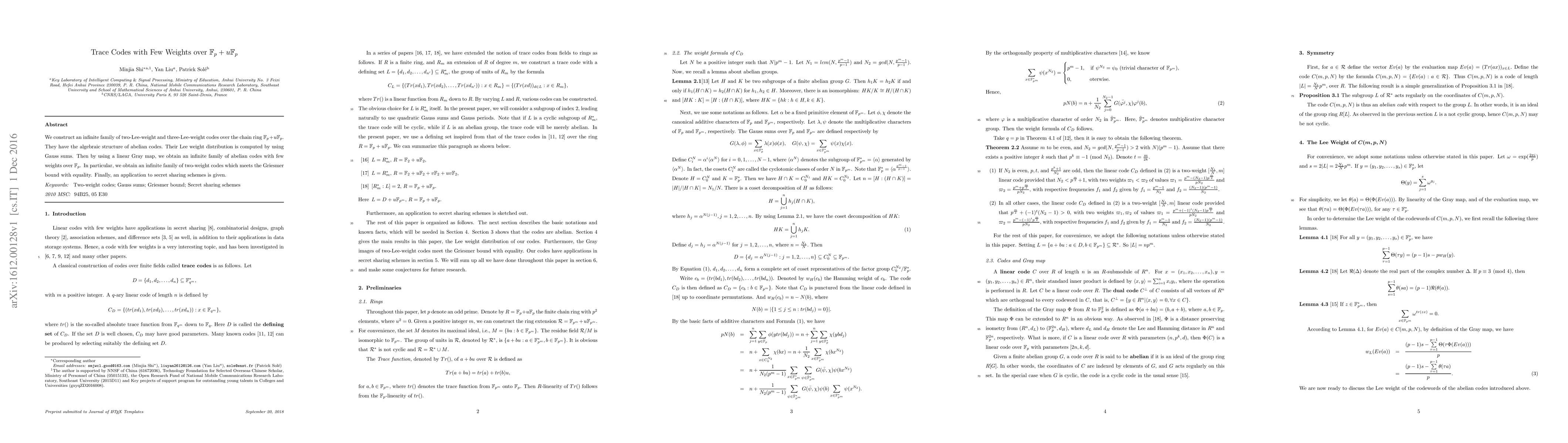 This paper constructs an infinite family of abelian codes over the ring $\mathbb{F}_p+u\mathbb{F}_p$ with two-Lee-weight and three-Lee-weight properties, utilizing Gauss sums for weight distribution analysis. The study also applies a linear Gray map to derive codes with few weights over $\mathbb{F}_p$, achieving optimal two-weight codes meeting the Griesmer bound. The paper concludes with an application to secret sharing schemes.