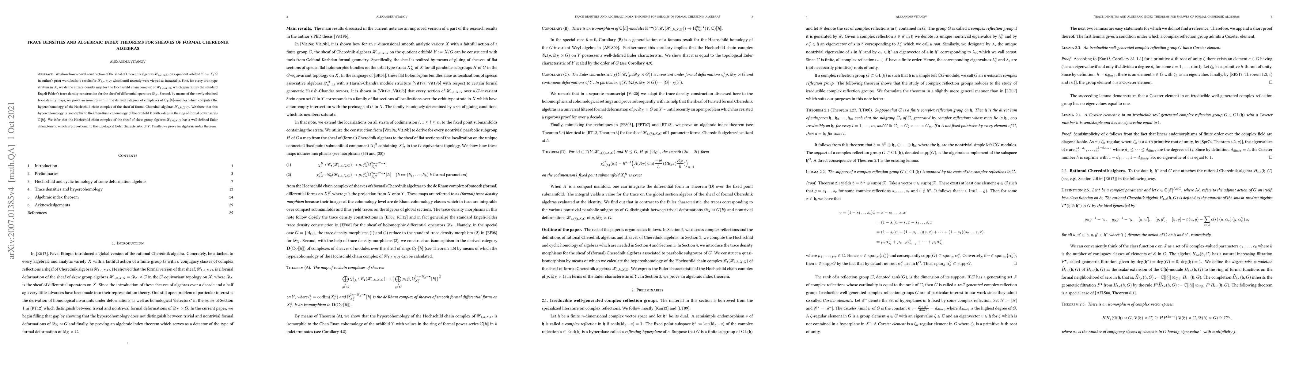 We show how a novel construction of the sheaf of Cherednik algebras on a quotient orbifold Y=X/G by virtue of formal geometry in author's prior work leads to results for the sheaf of Cherednik algebra which until recently were viewed as intractable. First, for every orbit type stratum in $X$, we define a trace density map for the Hochschild chain complex of the sheaf of Cherednik algebras, which generalises the standard Engeli-Felder's trace density construction for the sheaf of differential operators. Second, by means of the newly obtained trace density maps, we prove an isomorphism in the derived category of complexes of $\mathbb C_Y[[\hbar]]$-modules which computes the hypercohomology of the Hochschild chain complex $\mathcal{C}_{\bullet}$ of the sheaf of formal Cherednik algebras. We show that this hypercohomology is isomorphic to the Chen-Ruan cohomology of the orbifold $X/G$ with values in the ring of formal power series $\mathbb C[[\hbar]]$. We infer that the Hochschild chain complex of the sheaf of skew group algebras $\mathcal{D}_X\rtimes G$ has a well-defined Euler characteristic which is proportional to the topological Euler characteristic of $X/G$. Finally, we prove an algebraic index theorem.