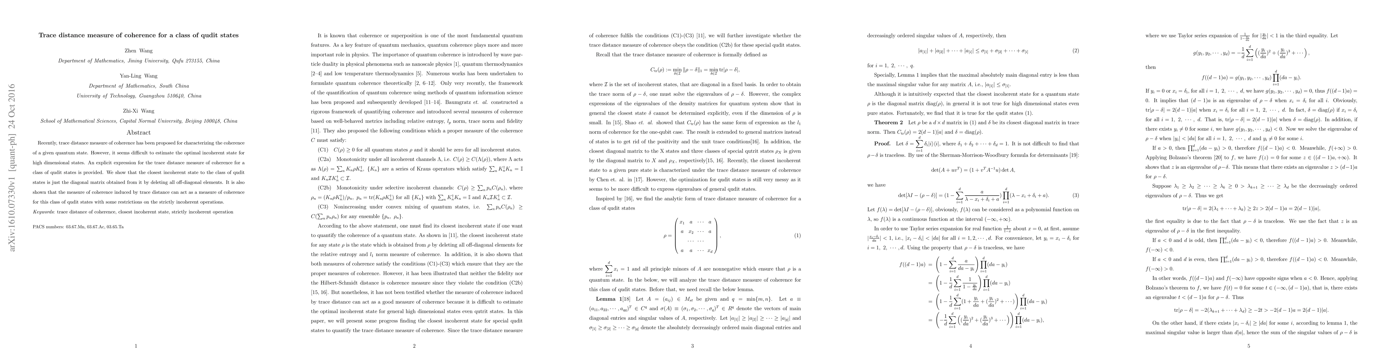 This paper proposes an explicit expression for the trace distance measure of coherence for a class of qudit states, demonstrating that the optimal incoherent state is the diagonal matrix obtained by removing all off-diagonal elements. It concludes that this measure can serve as a coherence metric under certain restrictions on incoherent operations.