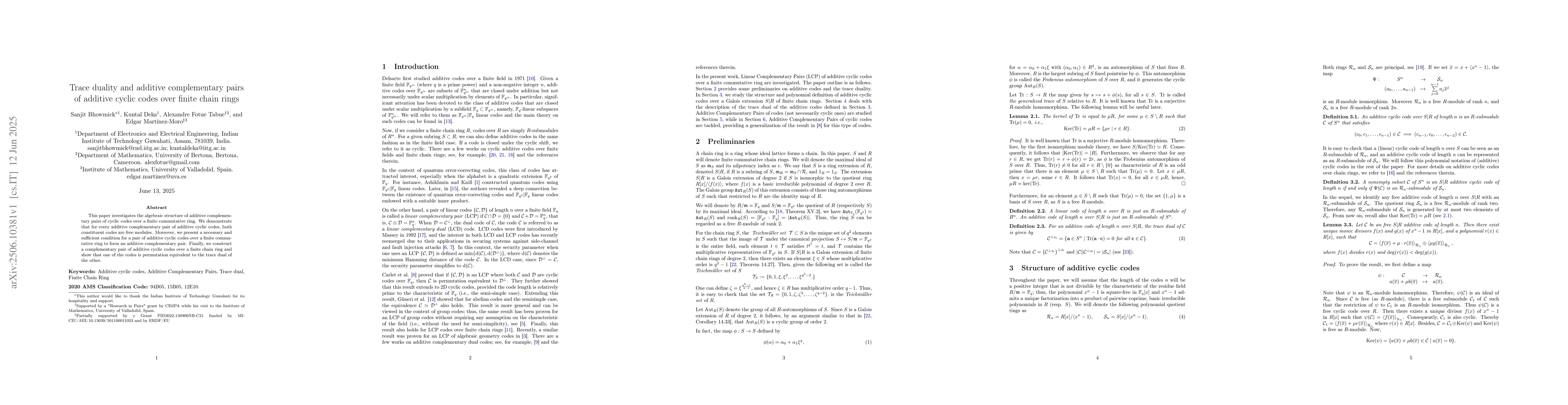 Research investigates additive complementary pairs of cyclic codes over finite commutative rings, showing that both codes in a pair are free modules and providing a necessary condition for forming such pairs.