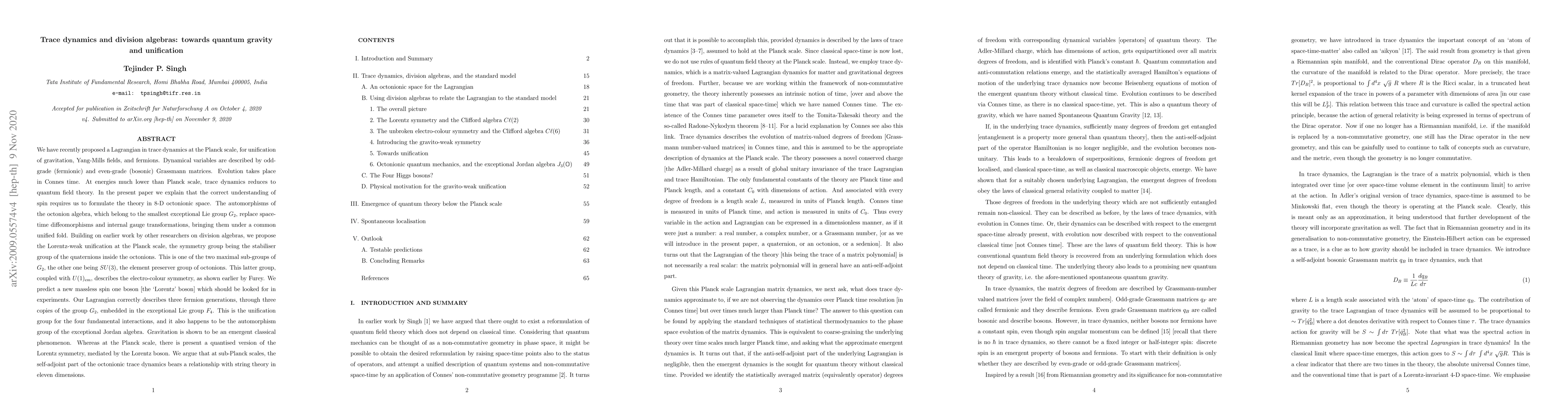 We have recently proposed a Lagrangian in trace dynamics at the Planck scale, for unification of gravitation, Yang-Mills fields, and fermions. Dynamical variables are described by odd-grade (fermionic) and even-grade (bosonic) Grassmann matrices. Evolution takes place in Connes time. At energies much lower than Planck scale, trace dynamics reduces to quantum field theory. In the present paper we explain that the correct understanding of spin requires us to formulate the theory in 8-D octonionic space. The automorphisms of the octonion algebra, which belong to the smallest exceptional Lie group $G_2$, replace space-time diffeomorphisms and internal gauge transformations, bringing them under a common unified fold. Building on earlier work by other researchers on division algebras, we propose the Lorentz-weak unification at the Planck scale, the symmetry group being the stabiliser group of the quaternions inside the octonions. This is one of the two maximal subgroups of $G_2$, the other one being $SU(3)$, the element preserver group of octonions. This latter group, coupled with $U(1)_{em}$, describes the electro-colour symmetry, as shown earlier by Furey. We predict a new massless spin one boson [the Lorentz boson] which should be looked for in experiments. Our Lagrangian correctly describes three fermion generations, through three copies of the group $G_2$, embedded in the exceptional Lie group $F_4$. This is the unification group for the four fundamental interactions, and it also happens to be the automorphism group of the exceptional Jordan algebra. Gravitation is shown to be an emergent classical phenomenon. Whereas at the Planck scale, there is present a quantised version of the Lorentz symmetry, mediated by the Lorentz boson. We argue that at sub-Planck scales, the self-adjoint part of the octonionic trace dynamics bears a relationship with string theory in eleven dimensions.