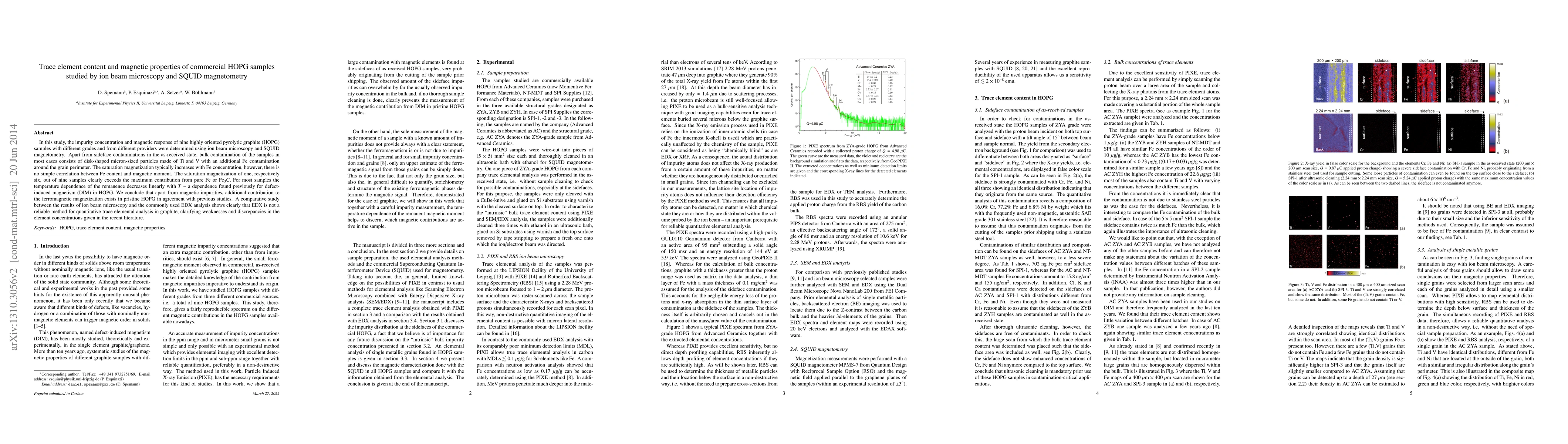 This research analyzes nine HOPG samples using ion beam microscopy and SQUID magnetometry, finding Ti, V, and Fe contamination. Magnetic properties vary, with some samples exceeding Fe/Fe3C contribution, indicating additional ferromagnetic sources. The study also reveals EDX as unreliable for trace elemental analysis in graphite.