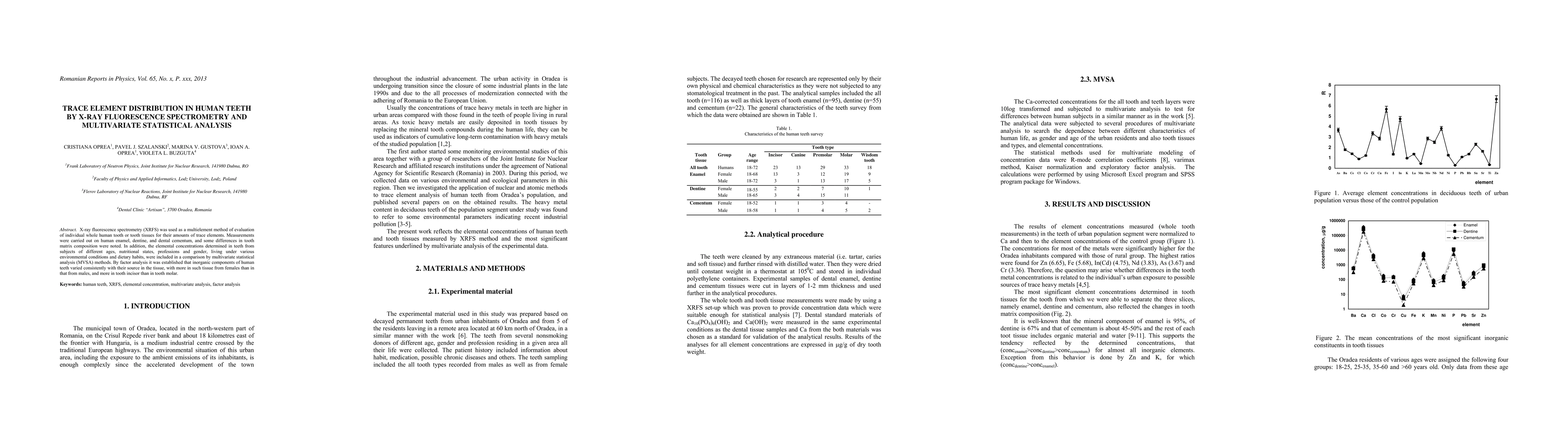 This paper uses X-ray fluorescence spectrometry to analyze trace elements in human teeth, focusing on enamel, dentine, and cementum. Multivariate statistical analysis reveals differences in elemental concentrations related to age, nutrition, profession, gender, and environmental conditions, with notable variations between tooth types and gender.