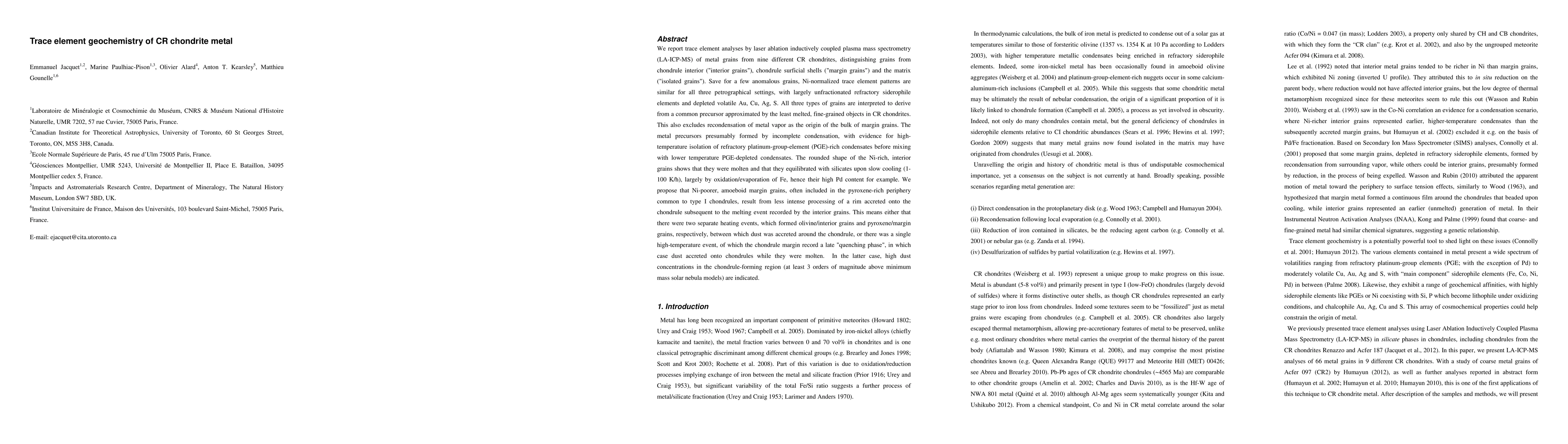 This study uses laser ablation ICP-MS to analyze trace elements in metal grains from CR chondrites, finding similar Ni-normalized patterns across different grain types, suggesting a common precursor. The research proposes a model of two heating events or a late "quenching phase" for the formation of margin grains.