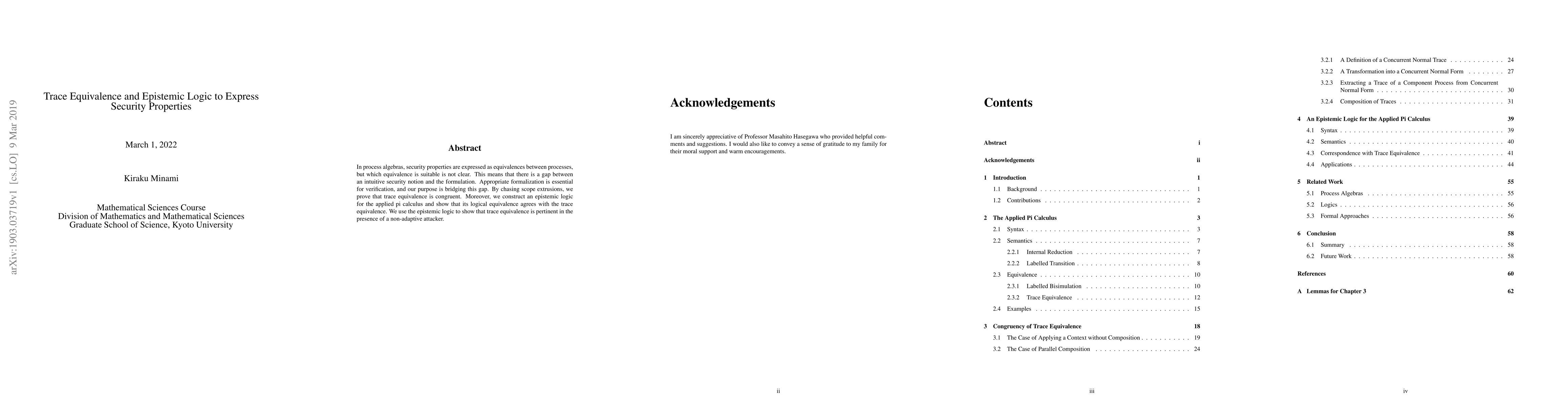 In process algebras, security properties are expressed as equivalences between processes, but which equivalence is suitable is not clear. This means that there is a gap between an intuitive security notion and the formulation. Appropriate formalization is essential for verification, and our purpose is bridging this gap. By chasing scope extrusions, we prove that trace equivalence is congruent. Moreover, we construct an epistemic logic for the applied pi calculus and show that its logical equivalence agrees with the trace equivalence. We use the epistemic logic to show that trace equivalence is pertinent in the presence of a non-adaptive attacker.
