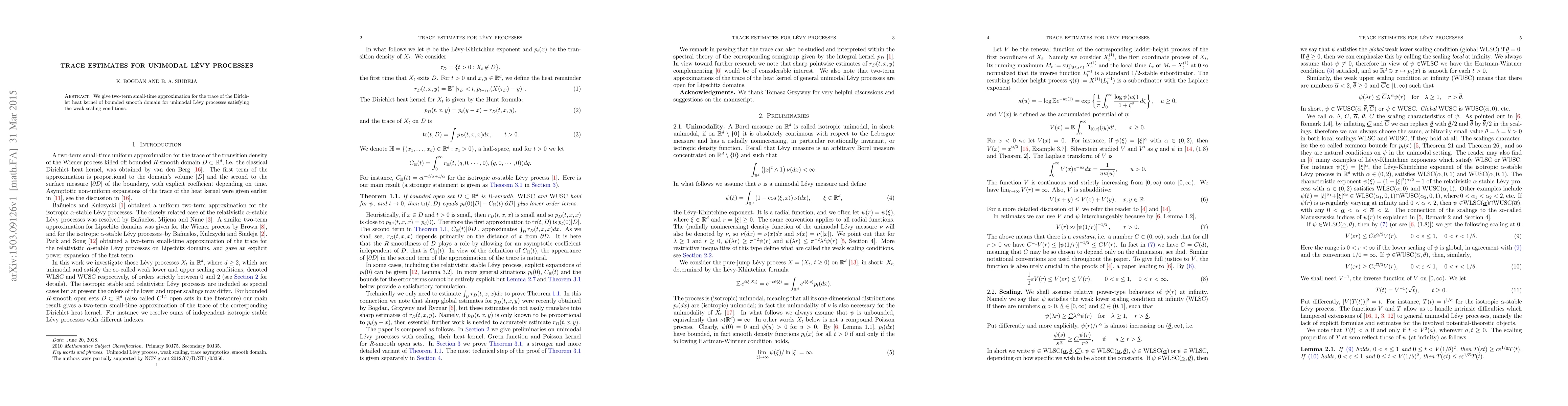 Summary: This paper provides a two-term approximation for the trace of the Dirichlet heat kernel in small time for unimodal Lévy processes within bounded smooth domains, under weak scaling conditions. The results enhance the understanding of the behavior of these processes in constrained environments.