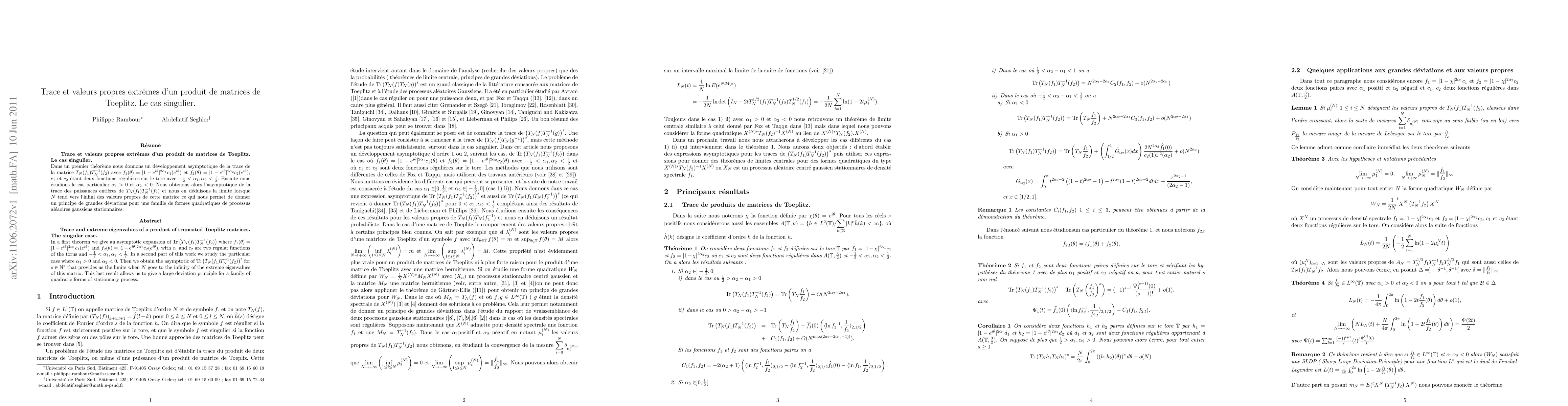 Trace and extreme eigenvalues of a product of truncated Toeplitz matrices. The singular case. In a first theorem we give an asymptotic expansion of Tr (T_N (f_1) T_N^{-1}(f_2)) where f1 ({\theta}) = |1 - e^{i {\theta}} | ^{2{{\alpha}1}c1 (ei{\theta}{\theta}) and f2 ({\theta}) = |1 - e ^{i{\theta}}| ^{2{\alpha}2}c2 (ei{\theta}), with c1 and c2 are two regular functions of the torus and - 1/2 < {\alpha}1, {\alpha}2 < 1/2 . In a second part of this work we study the particular case where {\alpha}1 > 0 and {\alpha}2 < 0. Then we obtain the asymptotic of the trace of the powers of Tr (T_N (f_1) T_N^{-1}(f_2)) for s {\in} N* that provides us the limits when N goes to the infinity of the extreme eigenvalues of this matrix. This last result allows us to give a large deviation principle for a family of quadratic forms of stationnary process.