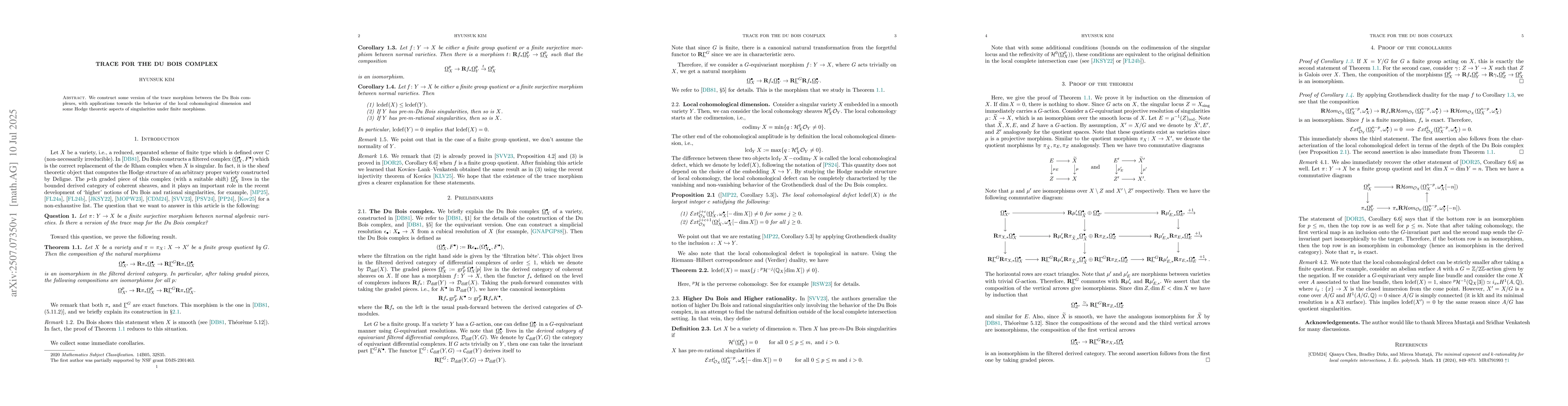 We construct some version of the trace morphism between the Du Bois complexes, with applications towards the behavior of the local cohomological dimension and some Hodge theoretic aspects of singularities under finite morphisms.