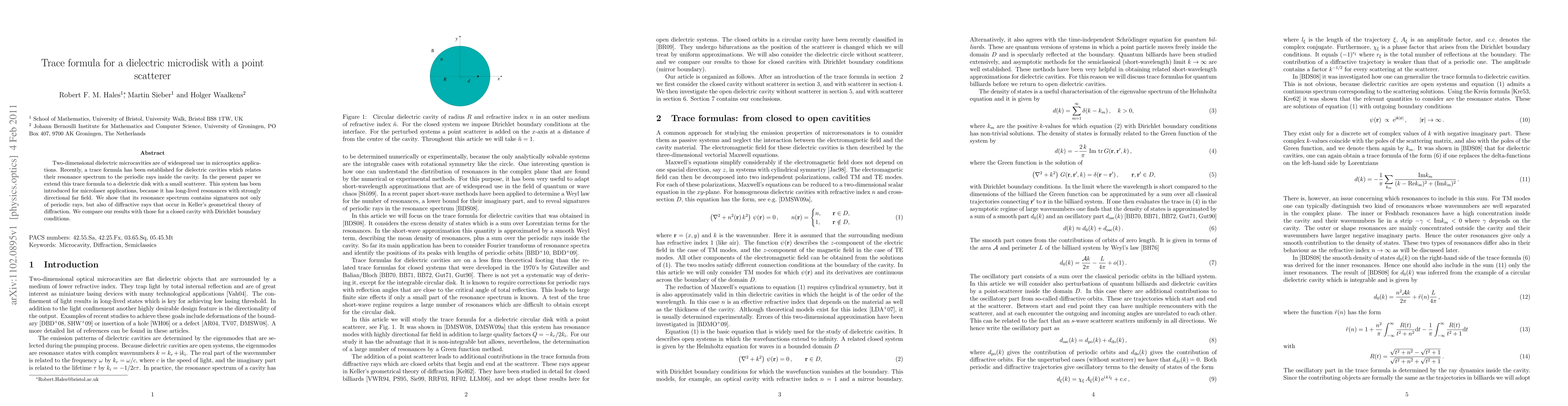 This paper extends the trace formula for dielectric microcavities to a dielectric microdisk with a point scatterer, revealing resonance signatures from both periodic and diffractive rays. The results are compared to those of a closed cavity with Dirichlet boundary conditions.