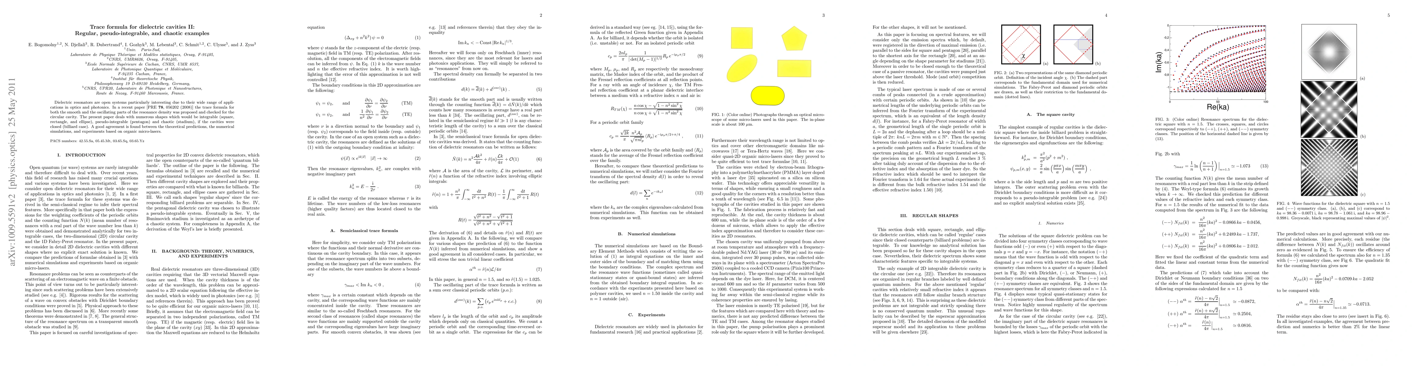 This paper extends the trace formula for dielectric cavities to various shapes, including regular, pseudo-integrable, and chaotic examples. It finds good agreement between theoretical predictions, numerical simulations, and experimental results from organic micro-lasers.