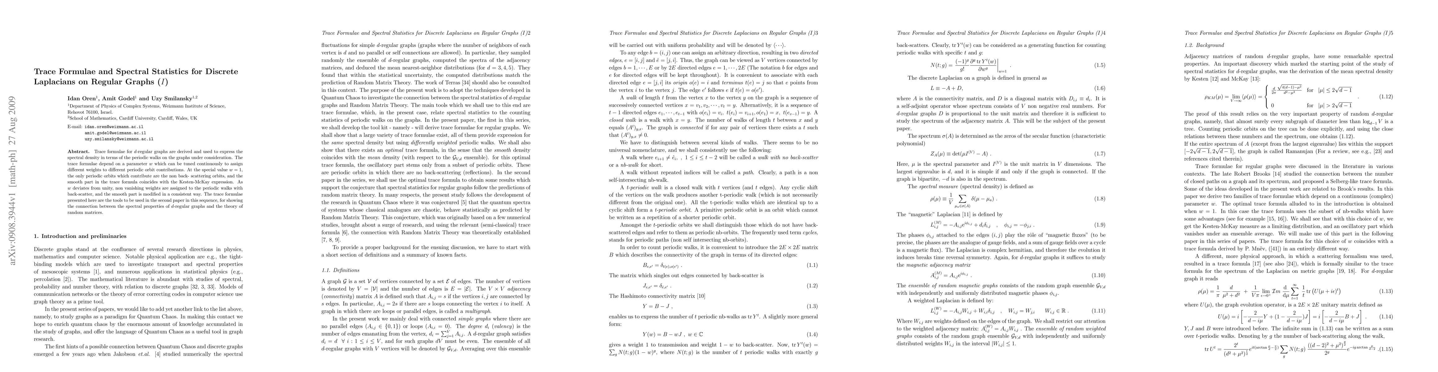 Summary: This paper derives trace formulae for d-regular graphs, expressing spectral density through periodic walks. At w=1, contributions are from non-back-scattering orbits aligning with the Kesten-McKay expression, while deviations adjust weights for back-scattering walks and modify the smooth part, setting the stage for linking spectral properties with random matrix theory in subsequent work.