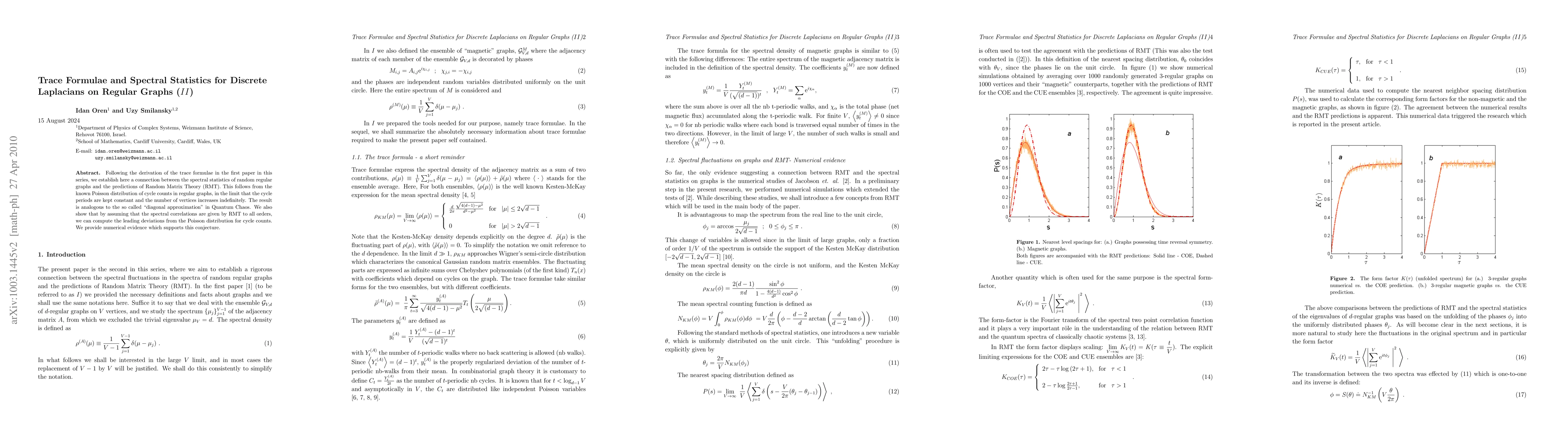 Following the derivation of the trace formulae in the first paper in this series, we establish here a connection between the spectral statistics of random regular graphs and the predictions of Random Matrix Theory (RMT). This follows from the known Poisson distribution of cycle counts in regular graphs, in the limit that the cycle periods are kept constant and the number of vertices increases indefinitely. The result is analogous to the so called "diagonal approximation" in Quantum Chaos. We also show that by assuming that the spectral correlations are given by RMT to all orders, we can compute the leading deviations from the Poisson distribution for cycle counts. We provide numerical evidence which supports this conjecture.