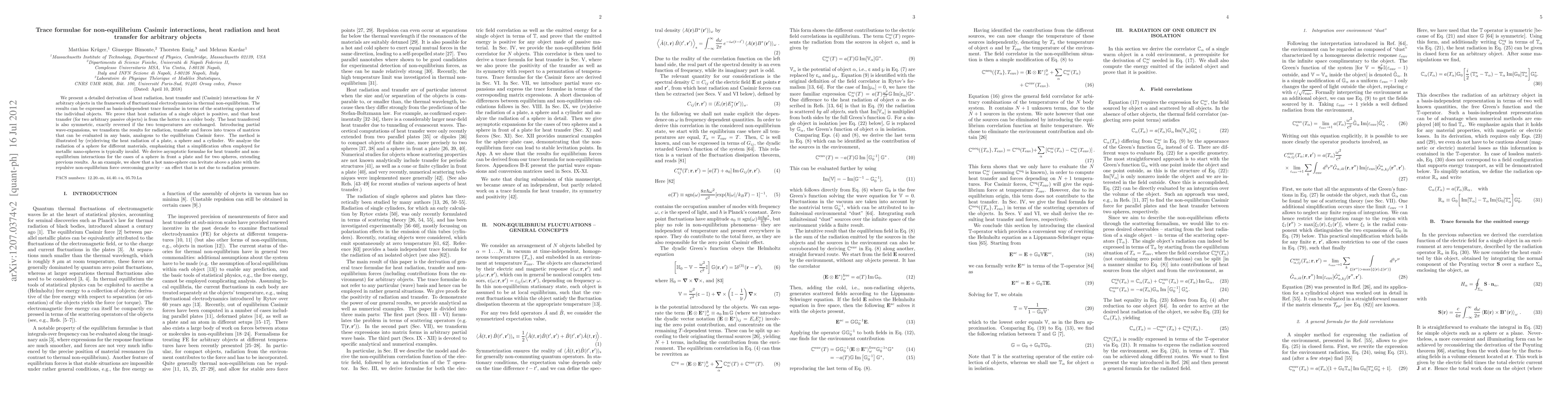 This paper derives trace formulae for non-equilibrium Casimir interactions, heat radiation, and heat transfer for N arbitrary objects using fluctuational electrodynamics. It proves the positivity of heat radiation and the directionality of heat transfer from hotter to colder bodies, and demonstrates the method through examples like a plate, sphere, and cylinder.
