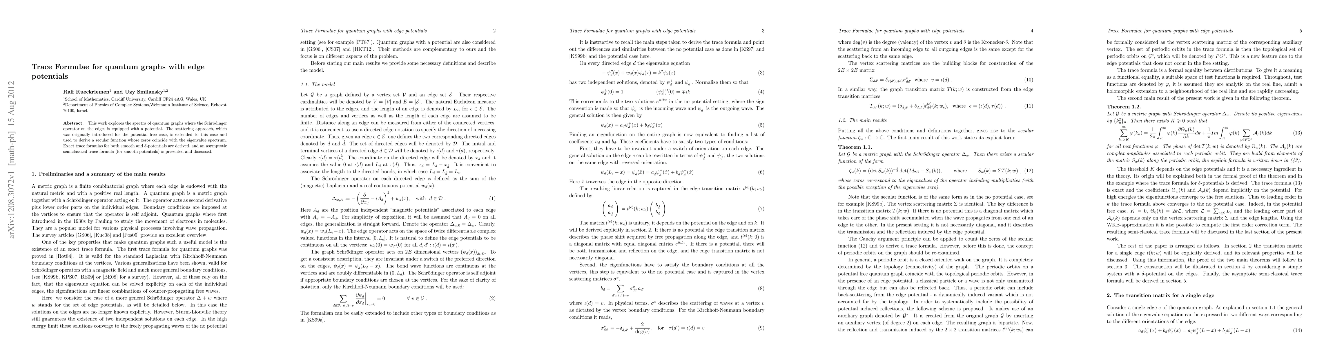 This paper extends the scattering approach to quantum graphs with edge potentials, deriving exact trace formulae for smooth and $\delta$-potentials and presenting an asymptotic semiclassical trace formula for smooth potentials. The zeros of the derived secular function correspond to the eigenvalue spectrum of the Schrödinger operator on the graph.