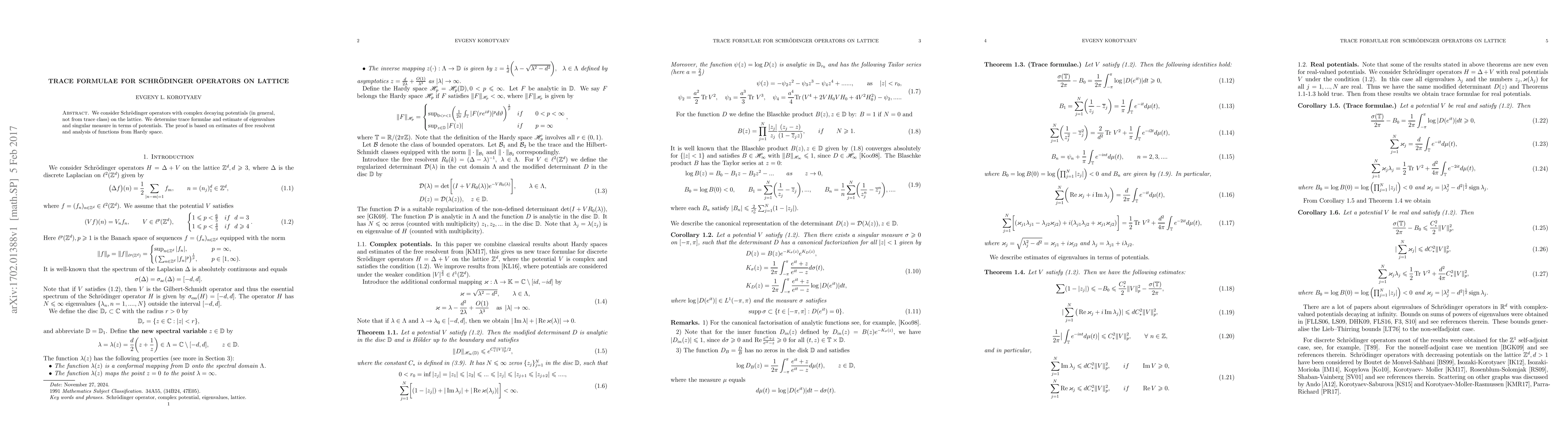 This paper determines trace formulae and estimates for eigenvalues and singular measures of Schrödinger operators on a lattice with complex decaying potentials, using resolvent estimates and analysis of Hardy space functions.