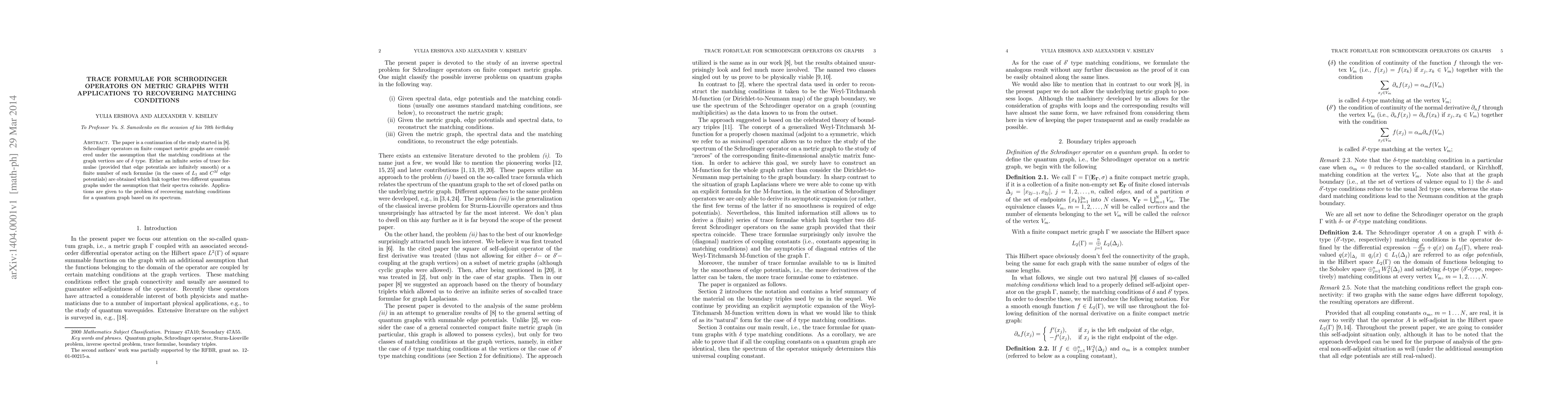 The paper develops trace formulae for Schrödinger operators on metric graphs, establishing infinite series or finite formulae linking quantum graphs with matching conditions inferred from their spectra. These results aid in recovering the matching conditions of a quantum graph using spectral information.