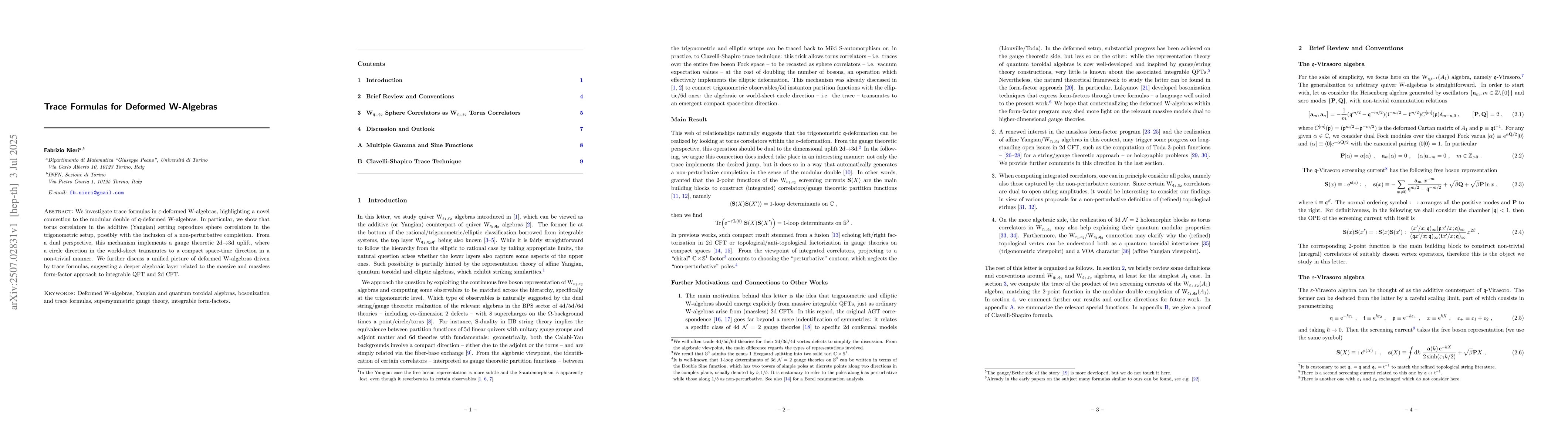 We investigate trace formulas in $\varepsilon$-deformed W-algebras, highlighting a novel connection to the modular double of $q$-deformed W-algebras. In particular, we show that torus correlators in the additive (Yangian) setting reproduce sphere correlators in the trigonometric setup, possibly with the inclusion of a non-perturbative completion. From a dual perspective, this mechanism implements a gauge theoretic 2d$\to$3d uplift, where a circle direction in the world-sheet transmutes to a compact space-time direction in a non-trivial manner. We further discuss a unified picture of deformed W-algebras driven by trace formulas, suggesting a deeper algebraic layer related to the massive and massless form-factor approach to integrable QFT and 2d CFT.