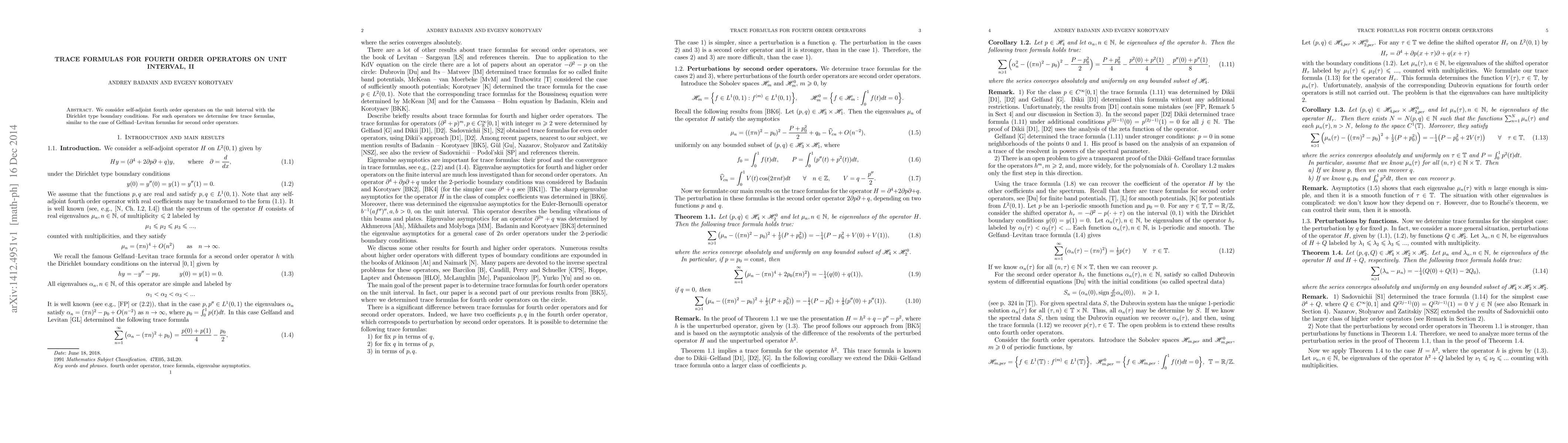 We consider self-adjoint fourth order operators on the unit interval with the Dirichlet type boundary conditions. For such operators we determine few trace formulas, similar to the case of Gelfand--Levitan formulas for second order operators.