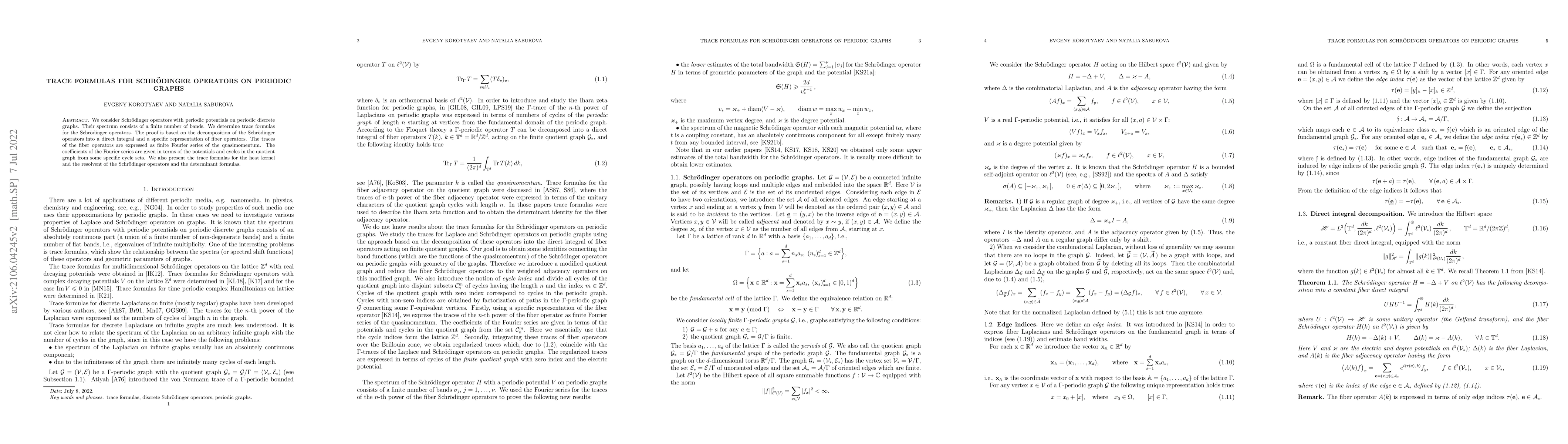 This paper develops trace formulas for Schrödinger operators on periodic discrete graphs, utilizing a decomposition into a direct integral and Fourier series representations of fiber operators. The trace expressions are linked to potentials and cycles in the quotient graph, and the study also includes heat kernel, resolvent, and determinant formulas.