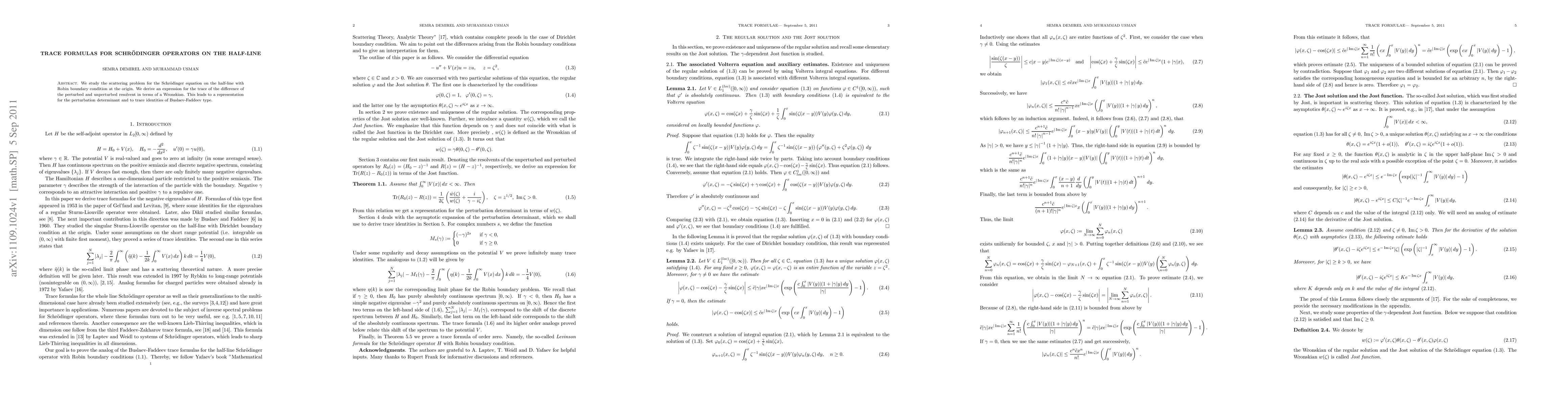 This paper develops trace formulas for the Schrödinger operator on the half-line with a Robin boundary condition, deriving an expression for the perturbation determinant and establishing trace identities akin to Buslaev-Faddeev formulas through a Wronskian representation.