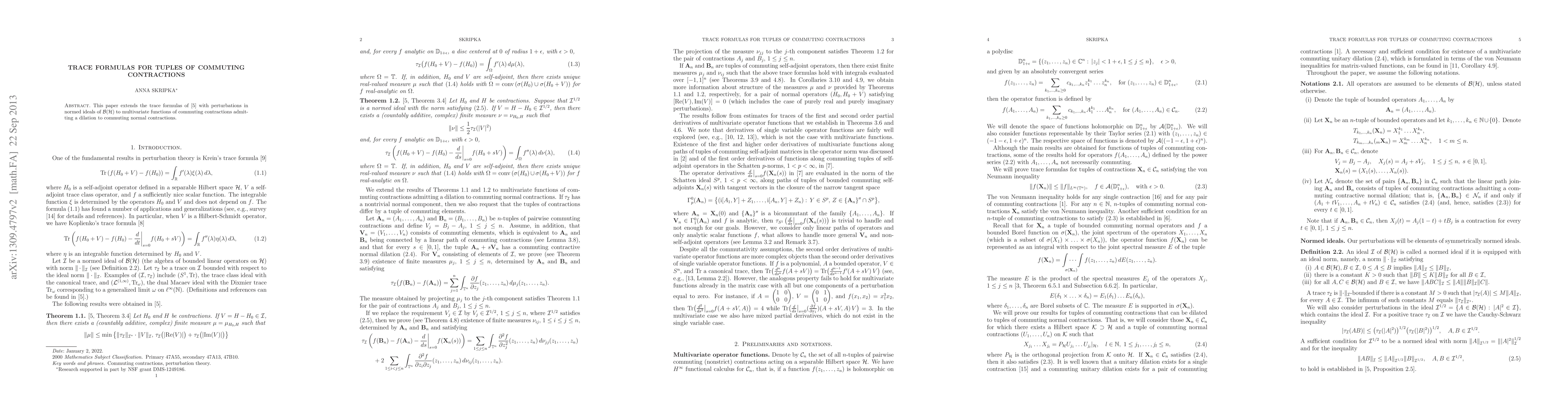 This paper extends trace formulas for multivariate functions of commuting contractions by incorporating perturbations within normed ideals of $B(H)$, and shows how these functions can be dilated to commuting normal contractions.