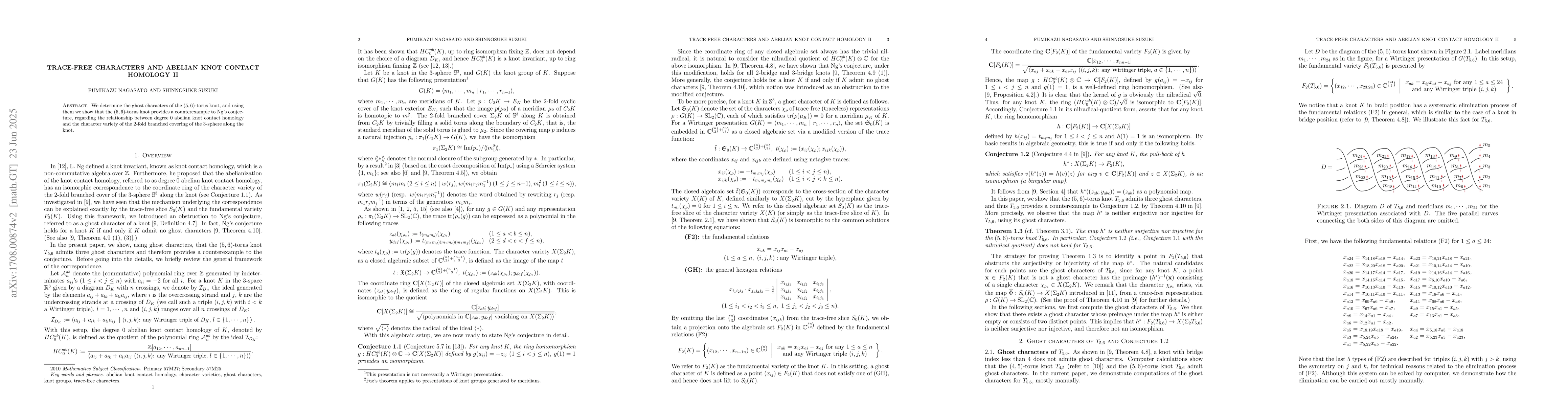 We calculate ghost characters for the (5,6)-torus knot, and using them we show that the (5,6)-torus knot gives a counter-example of Ng's conjecture concerned with the relationship between degree 0 abelian knot contact homology and the character variety of the 2-fold branched covering of the 3-sphere branched along the knot.