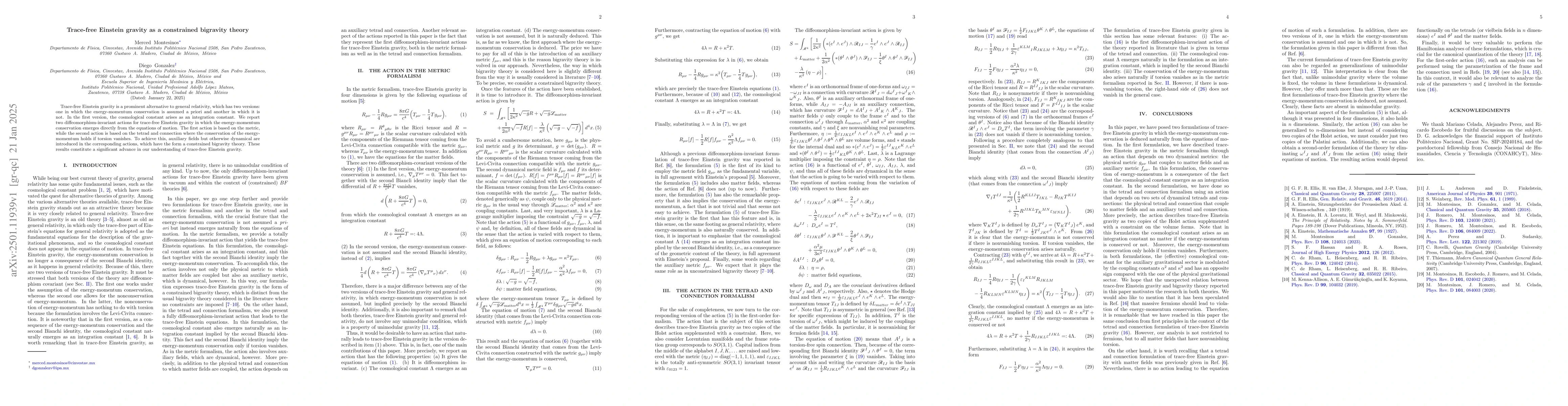 Trace-free Einstein gravity is a prominent alternative to general relativity, which has two versions: one in which the energy-momentum conservation is assumed a priori and another in which it is not. In the first version, the cosmological constant arises as an integration constant. We report two diffeomorphism-invariant actions for trace-free Einstein gravity in which the energy-momentum conservation emerges directly from the equations of motion. The first action is based on the metric, while the second action is based on the tetrad and connection where the conservation of the energy-momentum holds if torsion vanishes. To achieve this, auxiliary fields but otherwise dynamical are introduced in the corresponding actions, which have the form a constrained bigravity theory. These results constitute a significant advance in our understanding of trace-free Einstein gravity.