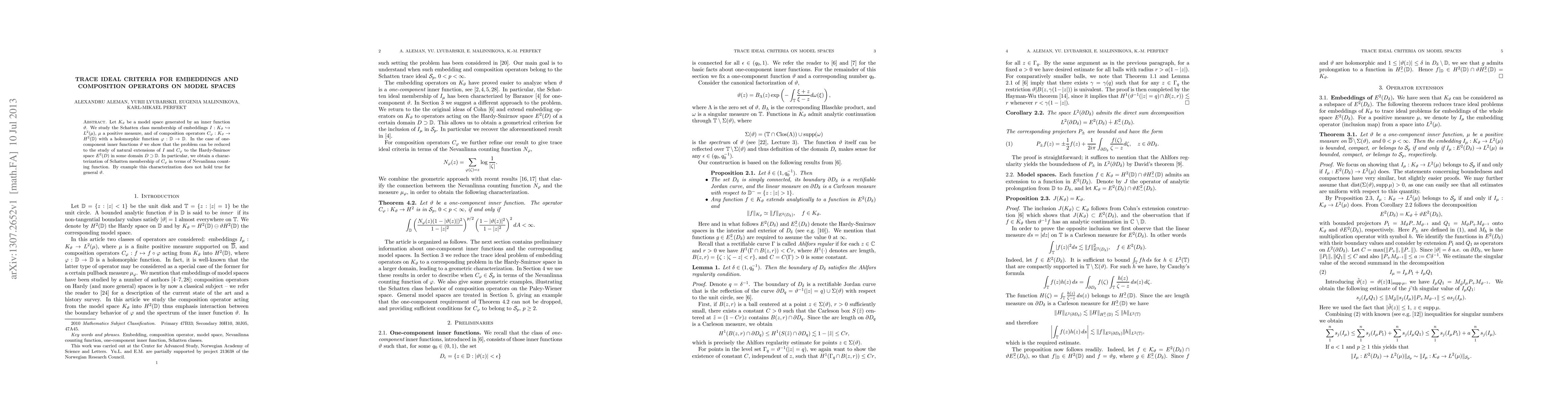 Let $K_\theta$ be a model space generated by an inner function $\theta$. We study the Schatten class membership of embeddings $I : K_\theta \to L^2(\mu)$, $\mu$ a positive measure, and of composition operators $C_\phi:K_\theta\to H^2(\mathbb D)$ with a holomprphic function $\phi:\mathbb D\rightarrow \mathbb D$. In the case of one-component inner functions $\theta$ we show that the problem can be reduced to the study of natural extensions of $I$ and $C_\phi$ to the Hardy-Smirnov space $E^2(D)$ in some domain $D\supset \mathbb D$. In particular, we obtain a characterization of Schatten membership of $C_\phi$ in terms of Nevanlinna counting function. By example this characterization does not hold true for general $\phi$.